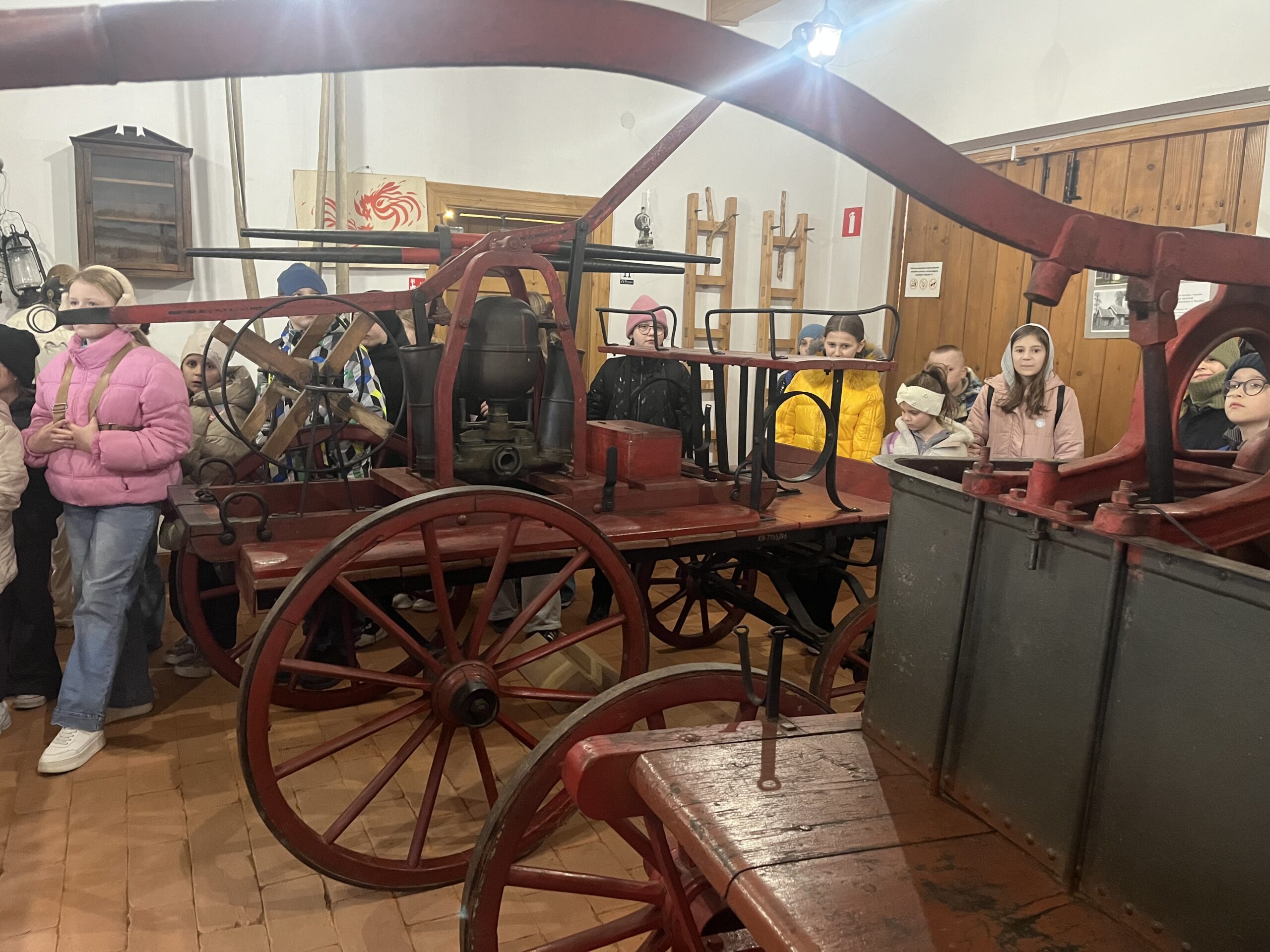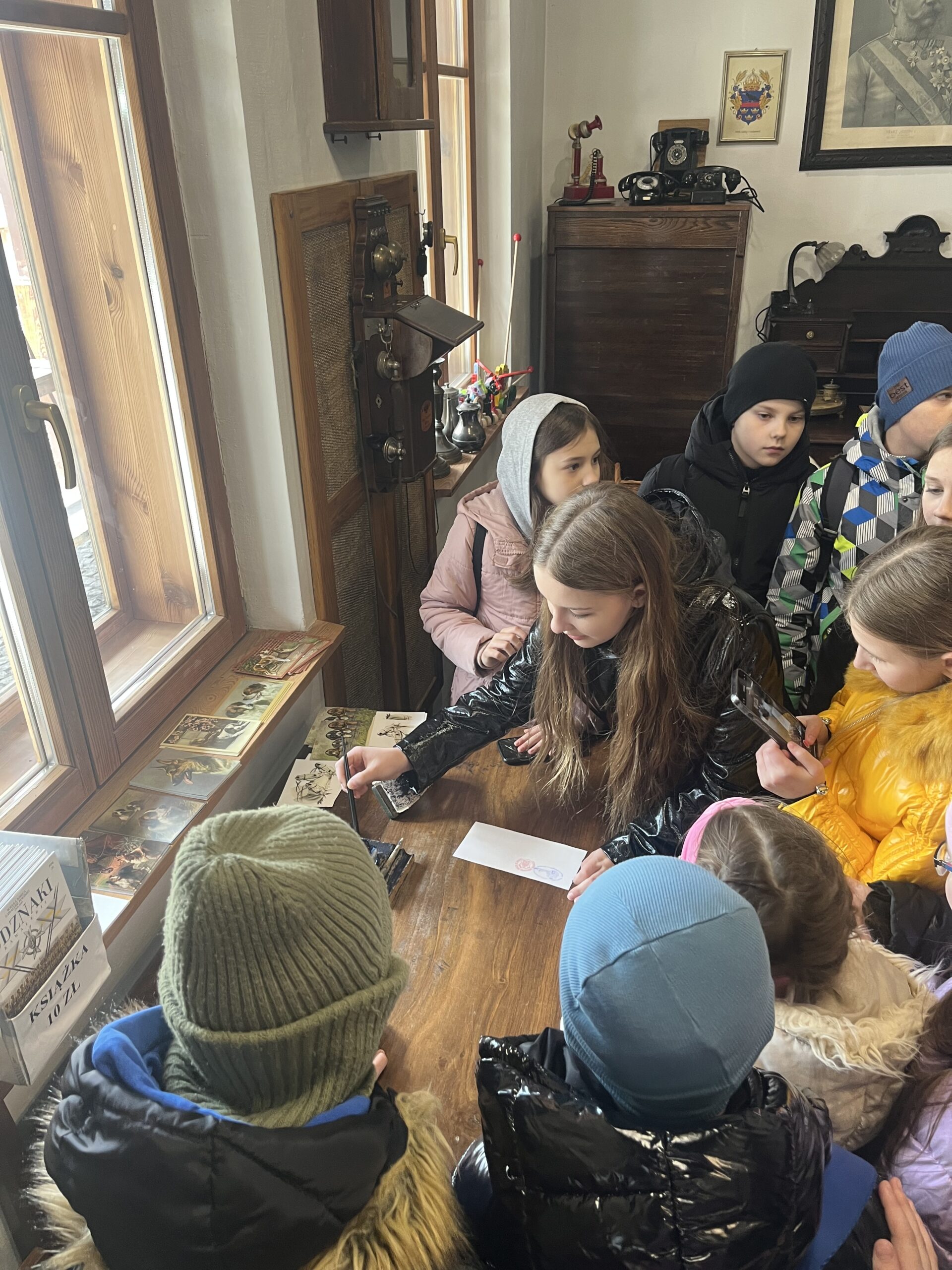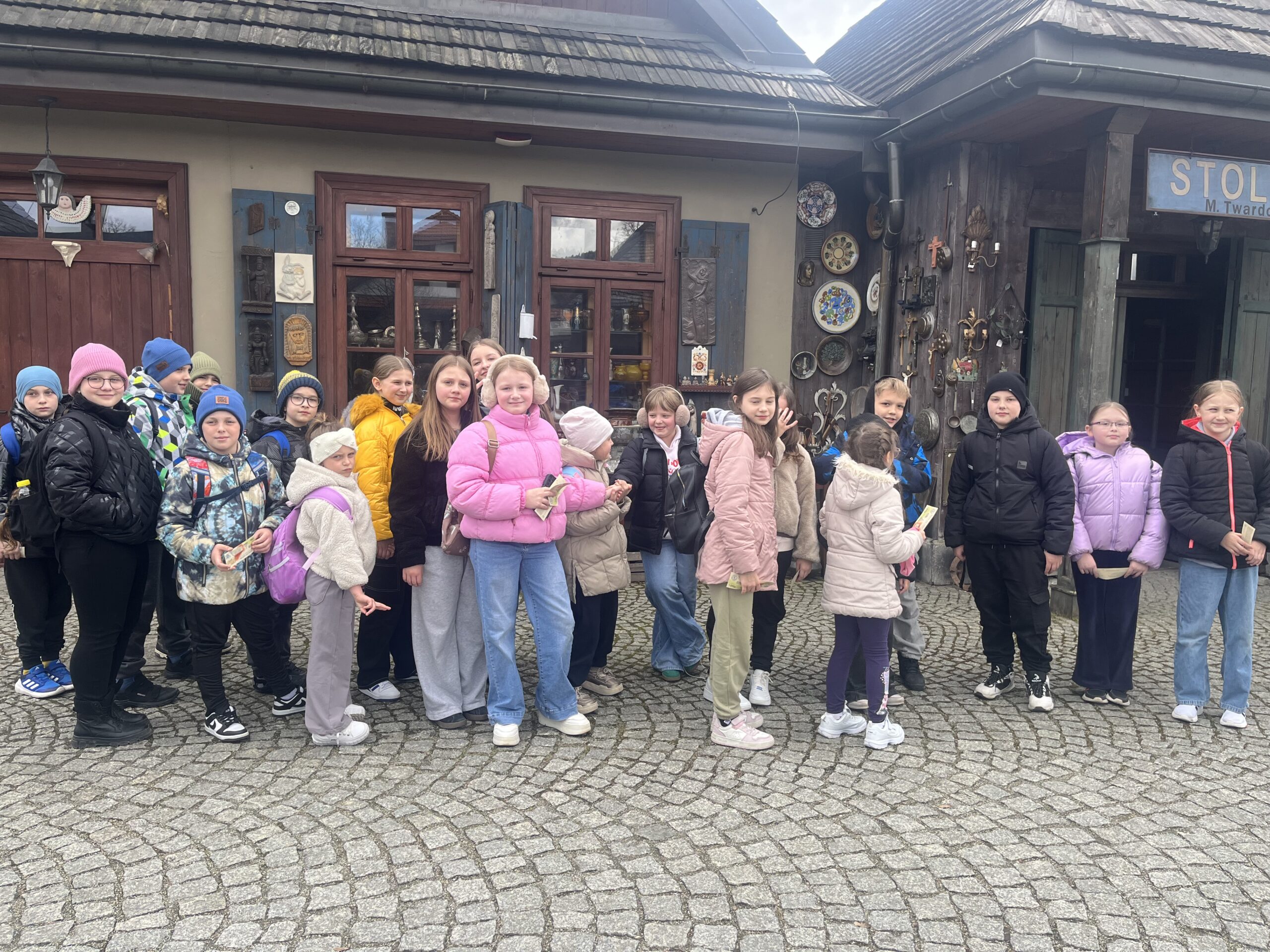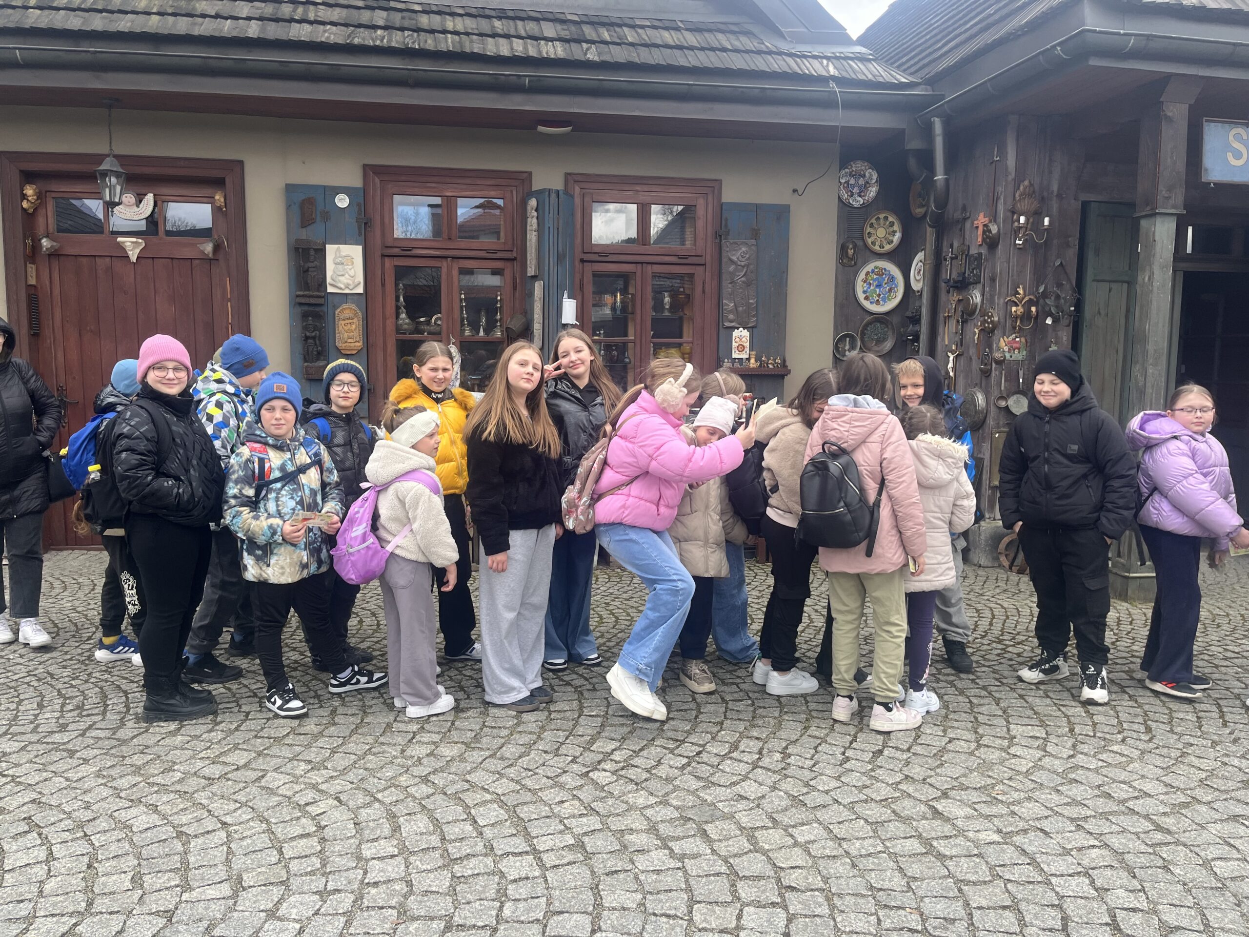Po emocjach teatralnych przyszedł czas na podróż w czasie – do realiów dawnej Galicji. Miasteczko Galicyjskie w Nowym Sączu przeniosło uczniów w rzeczywistość sprzed ponad stu lat. Przechadzając się brukowanymi uliczkami i zaglądając do klimatycznych wnętrz, dzieci miały okazję poznać świat dawnych zawodów i rzemiosła. W każdej z odwiedzanych chat czekał na nich przewodnik, który z pasją opowiadał o wybranej profesji. Uczniowie odwiedzili stolarza, który zaprezentował tradycyjne narzędzia do obróbki drewna oraz aptekarza, który pokazał, jak dawniej przygotowywano lekarstwa i ziołowe mikstury. W zakładzie dentystycznym dzieci mogły zobaczyć, jak wyglądała opieka stomatologiczna wiele lat temu bez współczesnych udogodnień. Dużym zainteresowaniem cieszyła się wizyta u fotografa, który zdradził tajniki wykonywania zdjęć w czasach, gdy każda klatka była wyjątkowa. Nie zabrakło również zwiedzania remizy strażackiej i opowieści o dawnych sposobach walki z ogniem. Pracownia zegarmistrza pozwoliła uczniom obejrzeć misterne mechanizmy dawnych zegarków, a w zakładzie fryzjerskim poznali prawdziwe wynalazki do układania włosów sprzed ponad wieku. Zwieńczeniem była wizyta na dawnej poczcie, gdzie dzieci mogły dowiedzieć się, jak wyglądał obieg korespondencji przed erą Internetu i telefonów komórkowych. Ta żywa lekcja historii okazała się dla uczniów fascynującym doświadczeniem i nie tylko wzbogaciła ich wiedzę, ale też rozbudziła ciekawość i zainteresowanie zawodami, które kształtowały codzienne życie naszych przodków i są profesjami nadal wykonywanymi.