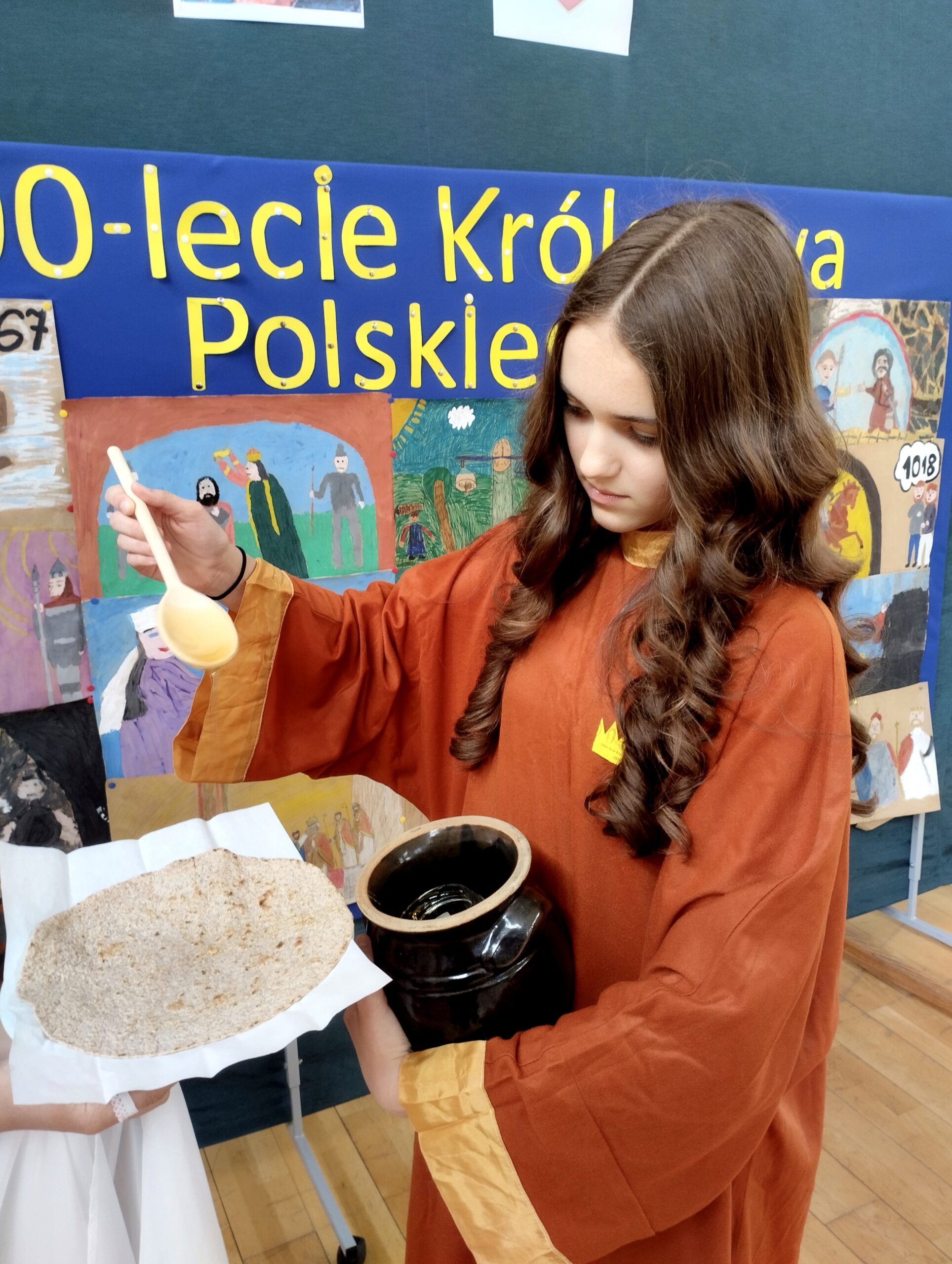 - „podpłomyki z miodem” inspirowane średniowieczną kuchnią, które osłodziły uczestnikom szkolny dzień poświęcony pierwszemu królowi Polski.