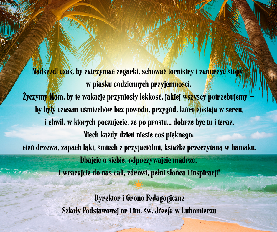 czerwiec 30 Bezpiecznych i udanych wakacji! Copyright © 2014. All rights reserved. Posted 30 czerwca 2025 by Anna in category Uncategorized Post navigation Uroczyste zakończenie roku szkolnego 2024/2025 w Szkole Podstawowej nr 1 im. św. Józefa w Lubomierzu Wakacyjny wypoczynek dzieci – Margonin 2025