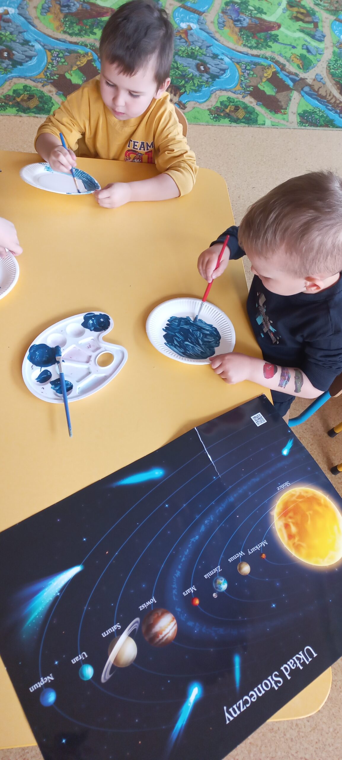 Dzieci tworzą planetę, malując papierowe talerzyki farbą w kolorze granatowym.