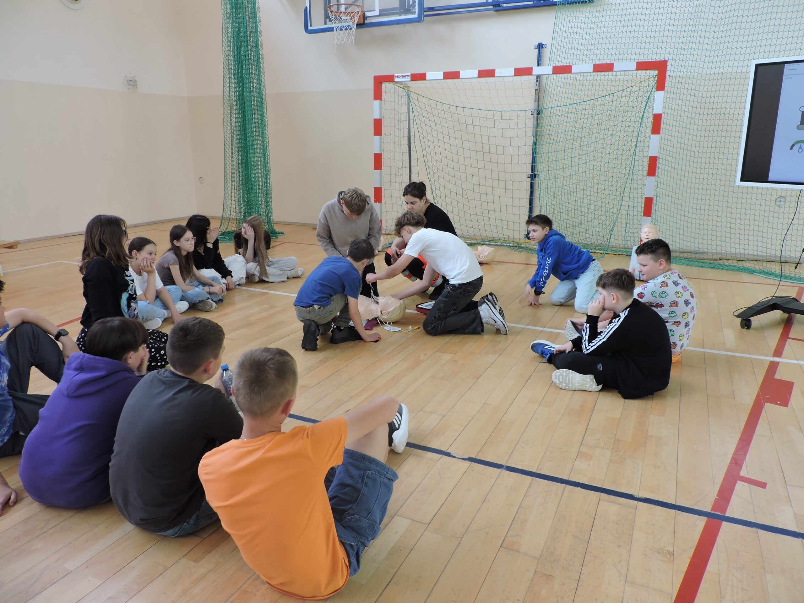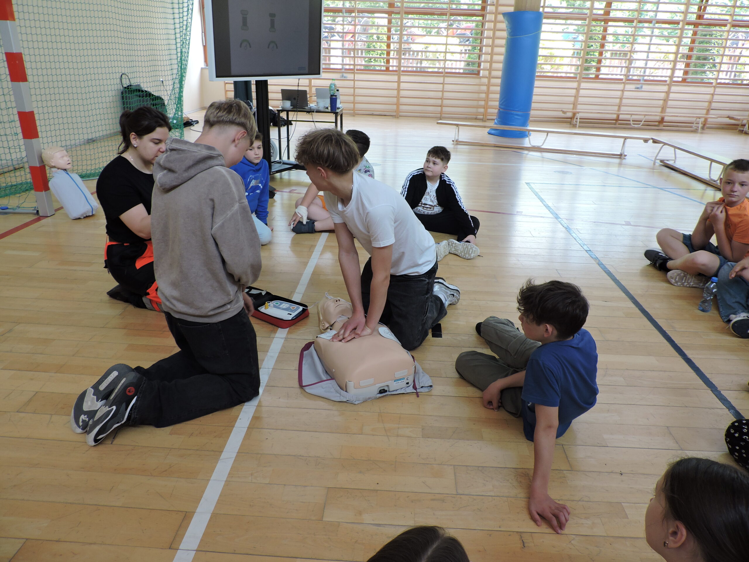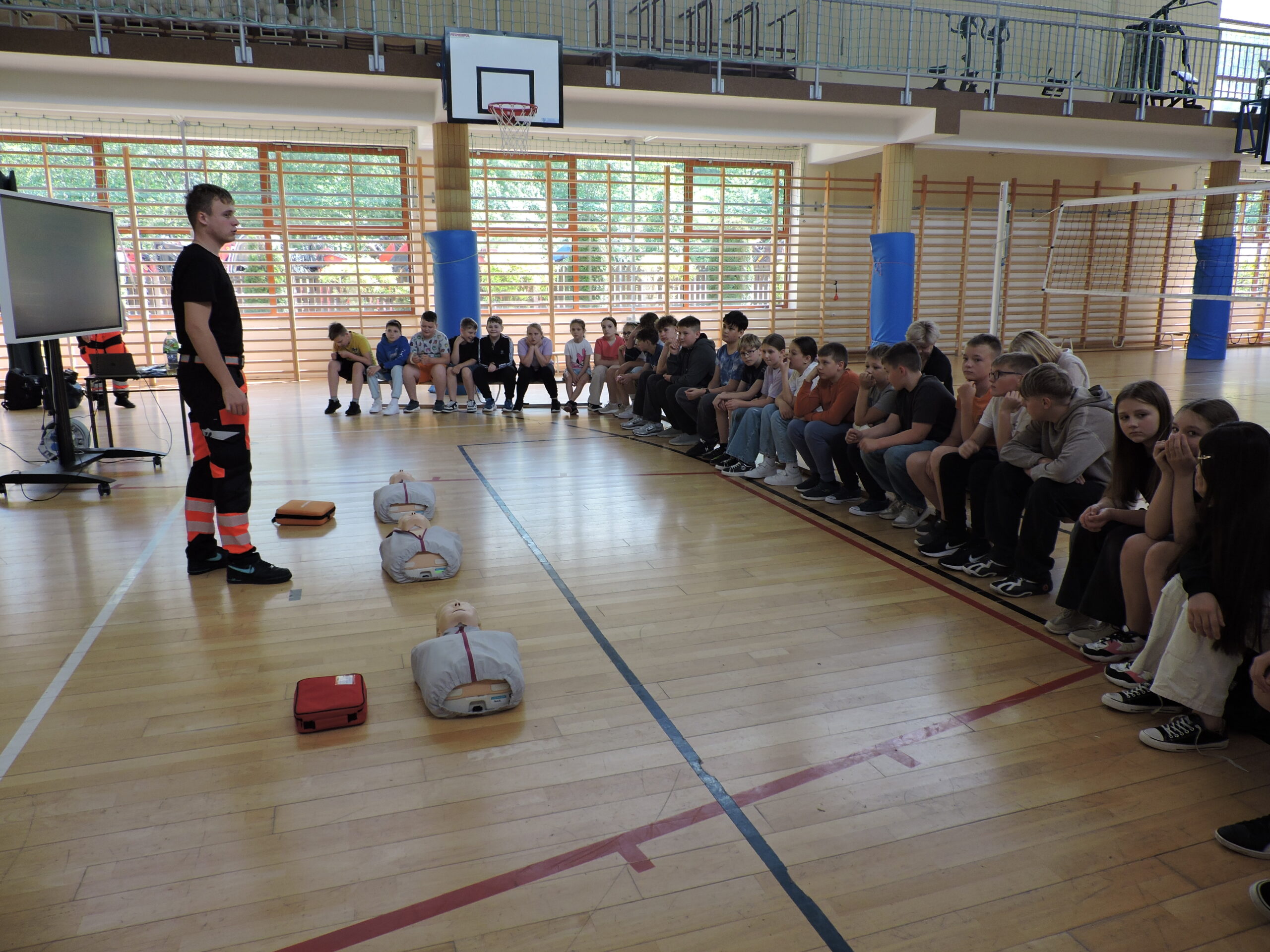Dnia 5 czerwca 2025r. w naszej szkole odbył się kurs pierwszej pomocy skierowany do uczniów klas 4–6. Zajęcia zostały przeprowadzone przez Olę i Bartka – studentów kierunków medycznych oraz ratownictwa medycznego, którzy z pasją i zaangażowaniem dzielili się swoją wiedzą i doświadczeniem. Celem kursu było nie tylko przekazanie uczniom podstawowych umiejętności udzielania pierwszej pomocy, ale również budowanie świadomości, jak ważna jest szybka reakcja w sytuacjach zagrożenia życia i zdrowia. Podczas zajęć uczniowie mieli okazję dowiedzieć się, m.in. jak sprawdzić przytomność osoby poszkodowanej, jak wezwać pomoc, a także jak prawidłowo wykonać resuscytację krążeniowo-oddechową (RKO). Dużym zainteresowaniem cieszyły się również ćwiczenia praktyczne z użyciem fantomów oraz pokaz użycia automatycznego defibrylatora zewnętrznego (AED). Dzięki interaktywnemu charakterowi zajęć uczniowie mogli samodzielnie przećwiczyć zdobyte umiejętności w bezpiecznych i kontrolowanych warunkach.