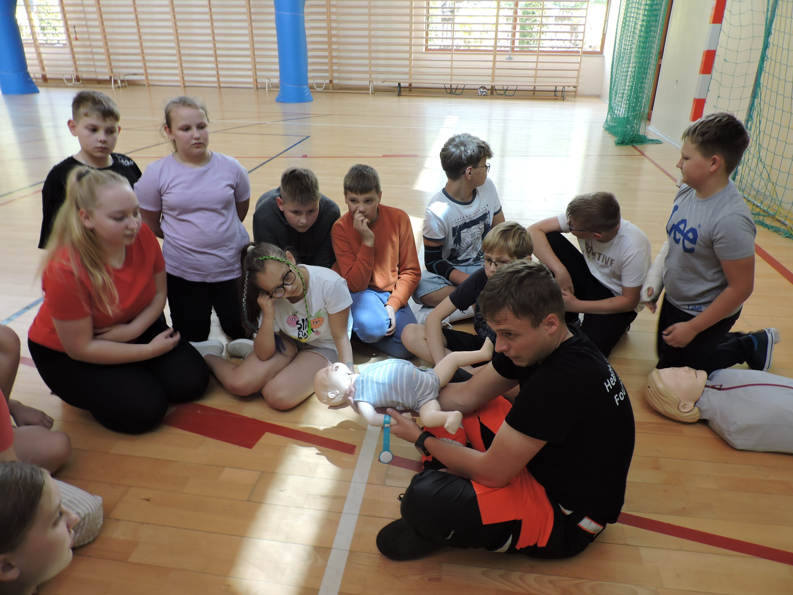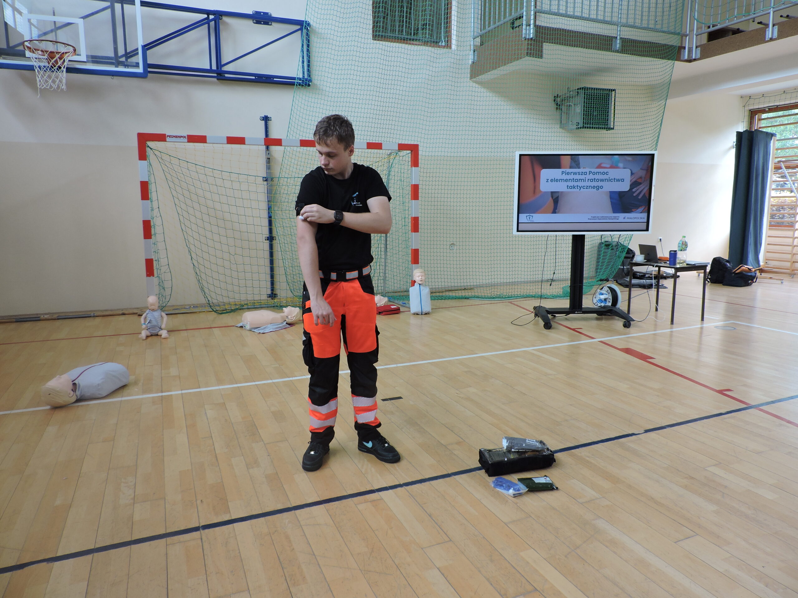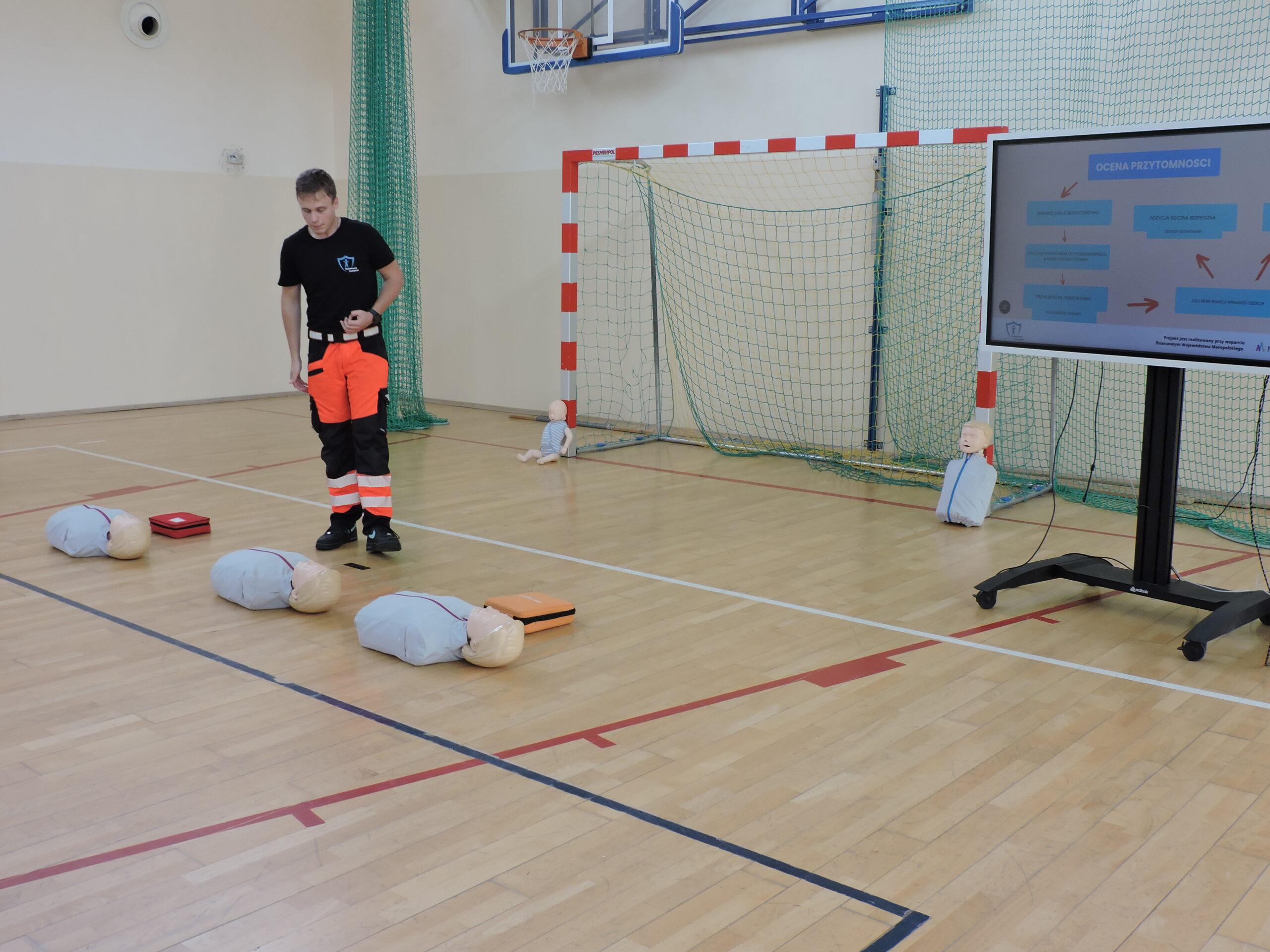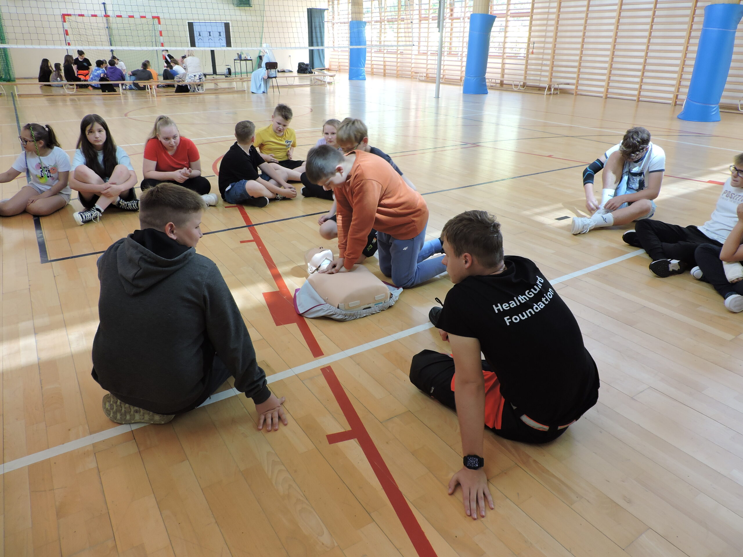 Dnia 5 czerwca 2025r. w naszej szkole odbył się kurs pierwszej pomocy skierowany do uczniów klas 4–6. Zajęcia zostały przeprowadzone przez Olę i Bartka – studentów kierunków medycznych oraz ratownictwa medycznego, którzy z pasją i zaangażowaniem dzielili się swoją wiedzą i doświadczeniem. Celem kursu było nie tylko przekazanie uczniom podstawowych umiejętności udzielania pierwszej pomocy, ale również budowanie świadomości, jak ważna jest szybka reakcja w sytuacjach zagrożenia życia i zdrowia. Podczas zajęć uczniowie mieli okazję dowiedzieć się, m.in. jak sprawdzić przytomność osoby poszkodowanej, jak wezwać pomoc, a także jak prawidłowo wykonać resuscytację krążeniowo-oddechową (RKO). Dużym zainteresowaniem cieszyły się również ćwiczenia praktyczne z użyciem fantomów oraz pokaz użycia automatycznego defibrylatora zewnętrznego (AED). Dzięki interaktywnemu charakterowi zajęć uczniowie mogli samodzielnie przećwiczyć zdobyte umiejętności w bezpiecznych i kontrolowanych warunkach.