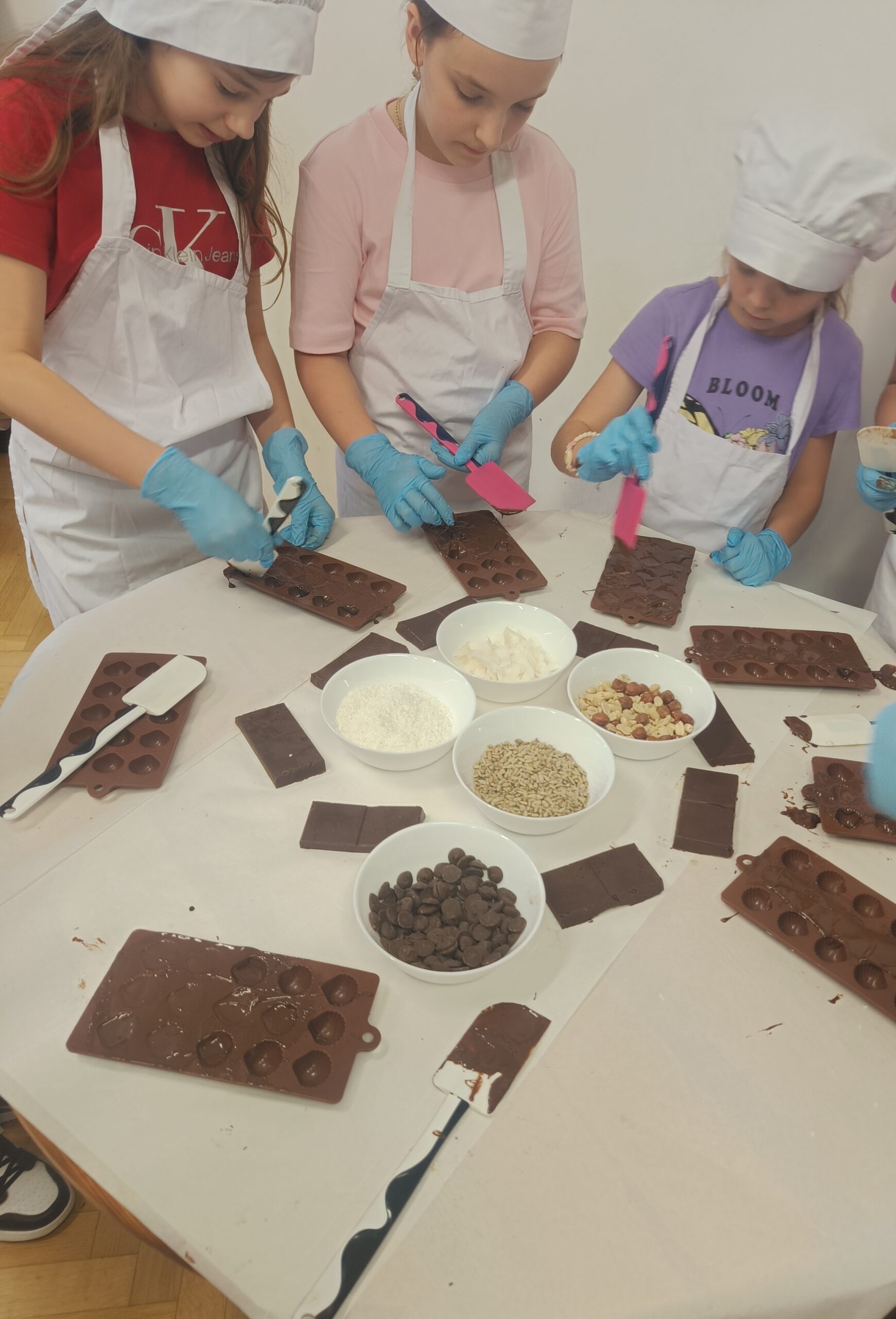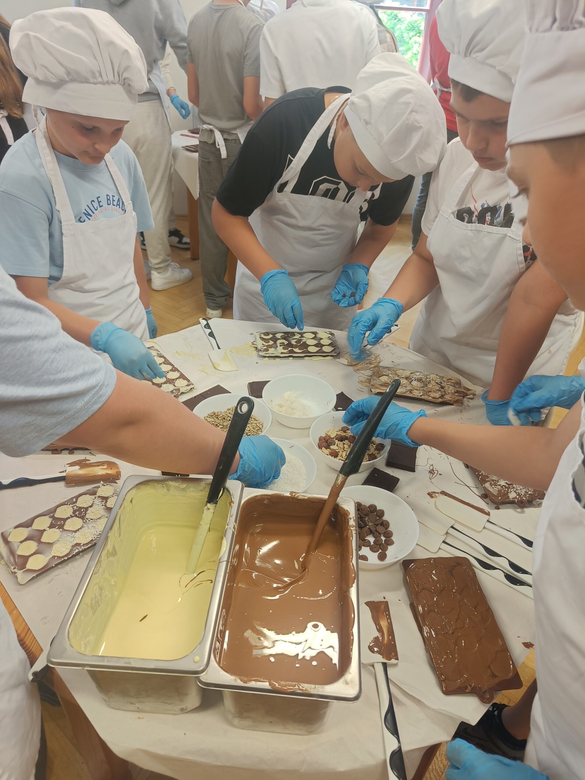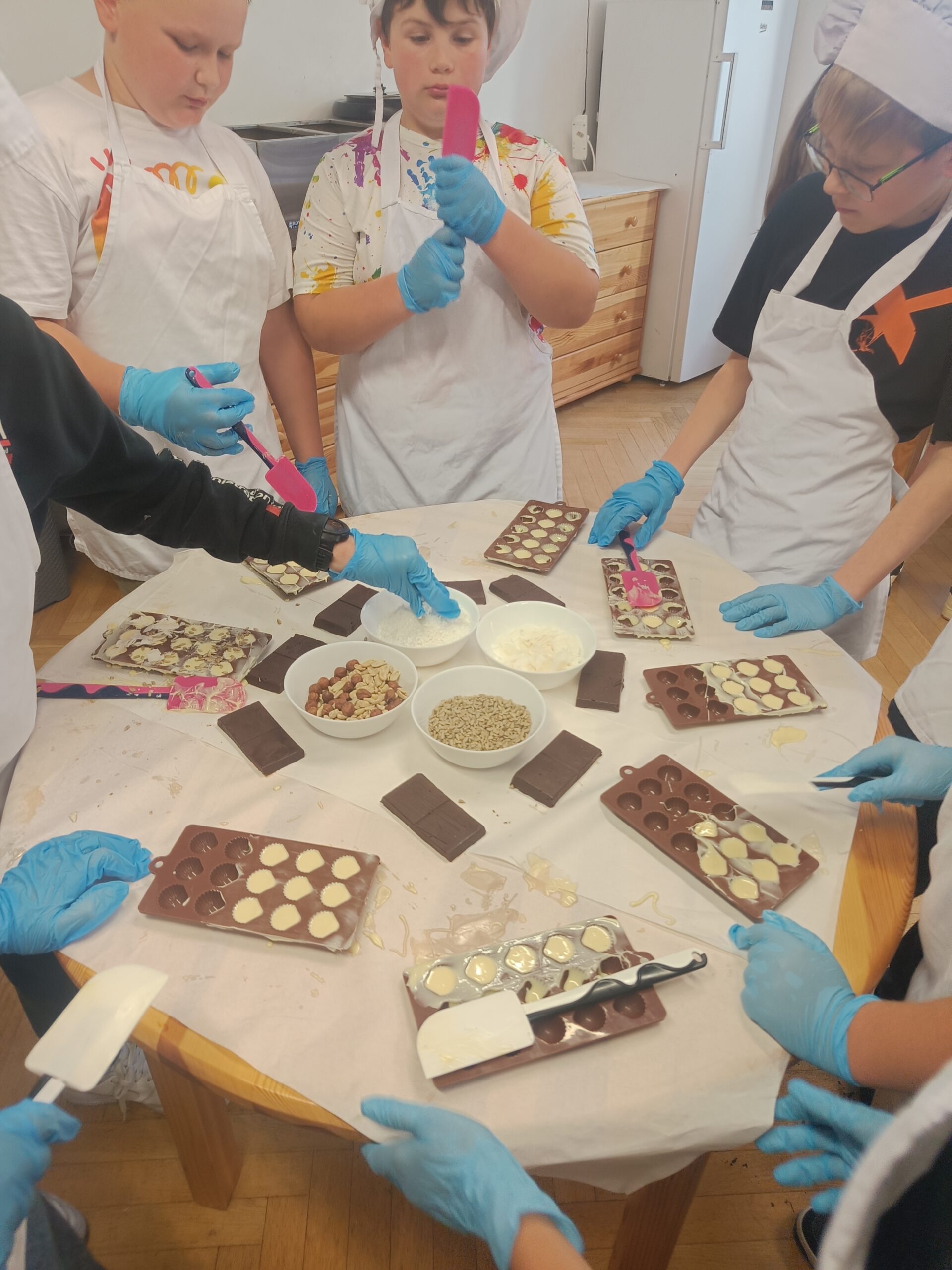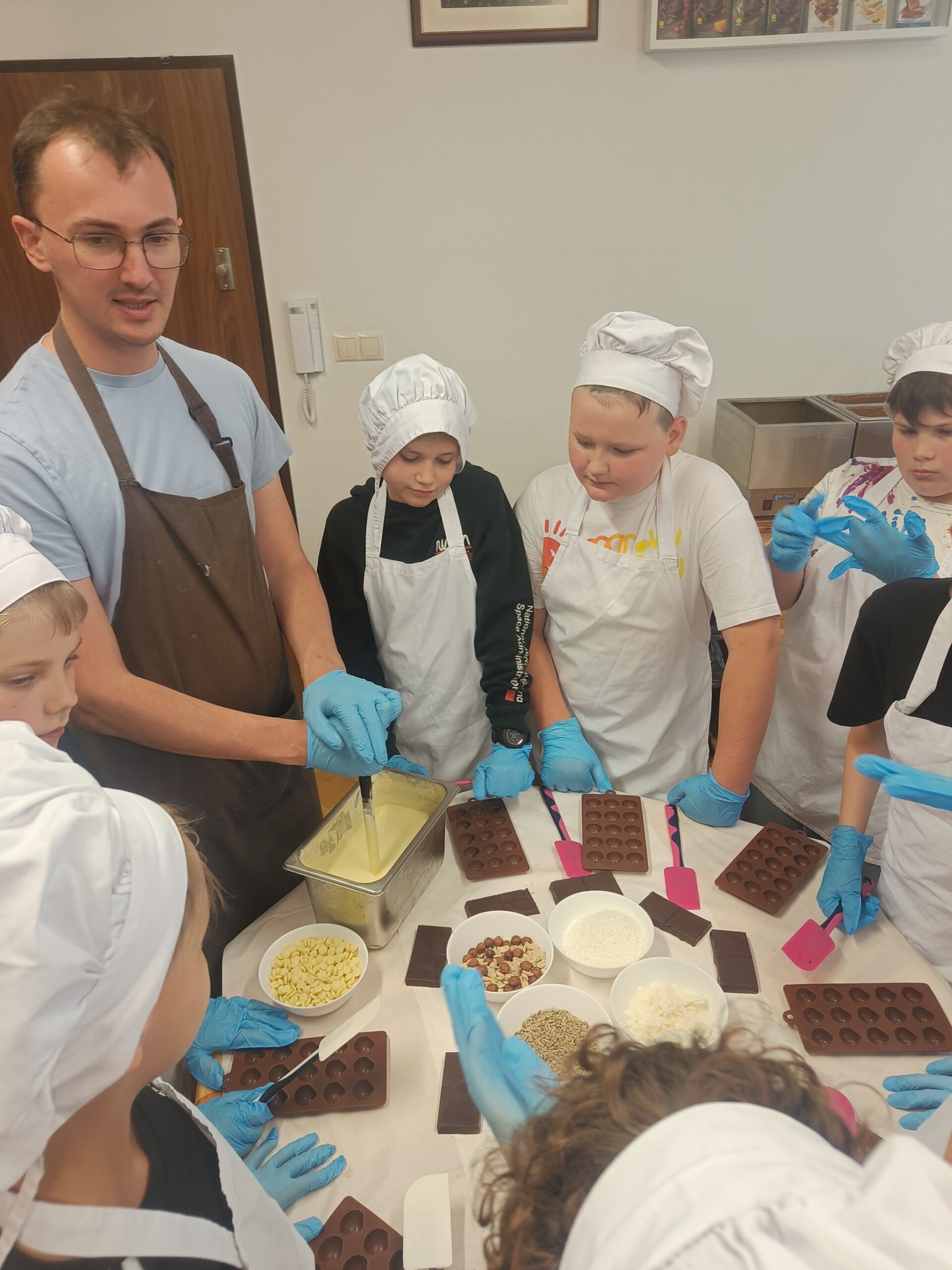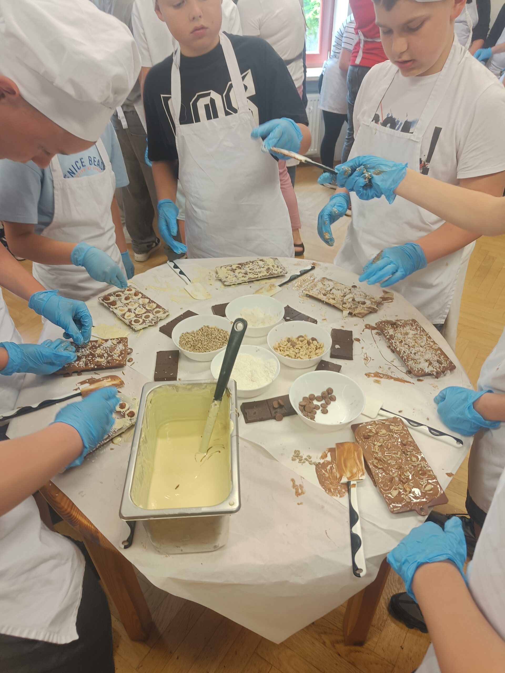 Uczniowie klasy 4, 5 i 6 wraz z wychowawczyniami i panią pedagog wybrali się na wycieczkę do Krakowa. Nasza pierwsza przygoda miała miejsce w Fabryce Czekolady Charliego. Po wejściu do środka od razu poczuliśmy przyjemny zapach czekolady, który unosił się w powietrzu. Pani przewodniczka zabrała nas w podróż po historii czekolady – od starożytnych Majów i Azteków, przez pierwsze tabliczki, aż po nowoczesną produkcję połączoną ze słodkim quizem wiedzy. Dowiedzieliśmy się, skąd pochodzi kakao, jak wyglądają plantacje kakaowca. Mieliśmy okazję zobaczyć autentyczny owoc kakaowca z Ekwadoru oraz ziarna kakaowe. Poznaliśmy proces powstawania znanych nam czekoladowych przysmaków. Największą atrakcją było jednak własnoręczne przygotowanie czekoladowych pralinek. Wszyscy uczniowie założyli stroje cukiernicze – fartuch i czepiec. Każdy dostał specjalną formę, do której mógł wlać ciepłą, płynną czekoladę i udekorować ją według własnego pomysłu. Kolorowe posypki, żelki, wiórki kokosowe, orzechy – do wyboru było wszystko, co dusza zapragnie. Można było puścić wodze fantazji. Na końcu z dumą zapakowaliśmy słodkie dzieła do torebek, by zabrać je do domu. Choć… niektórzy nie wytrzymali i zjedli już w drodze do autobusu.