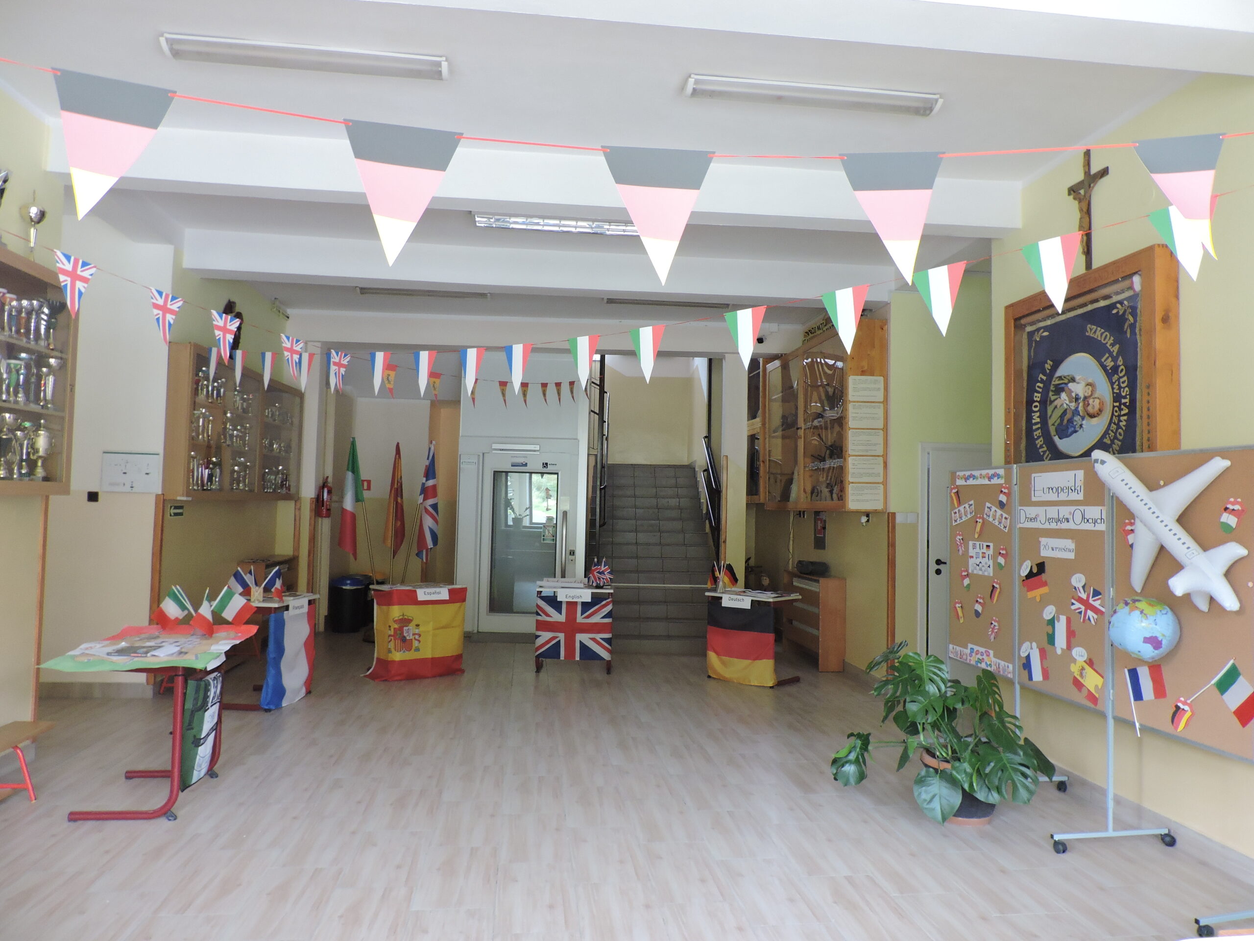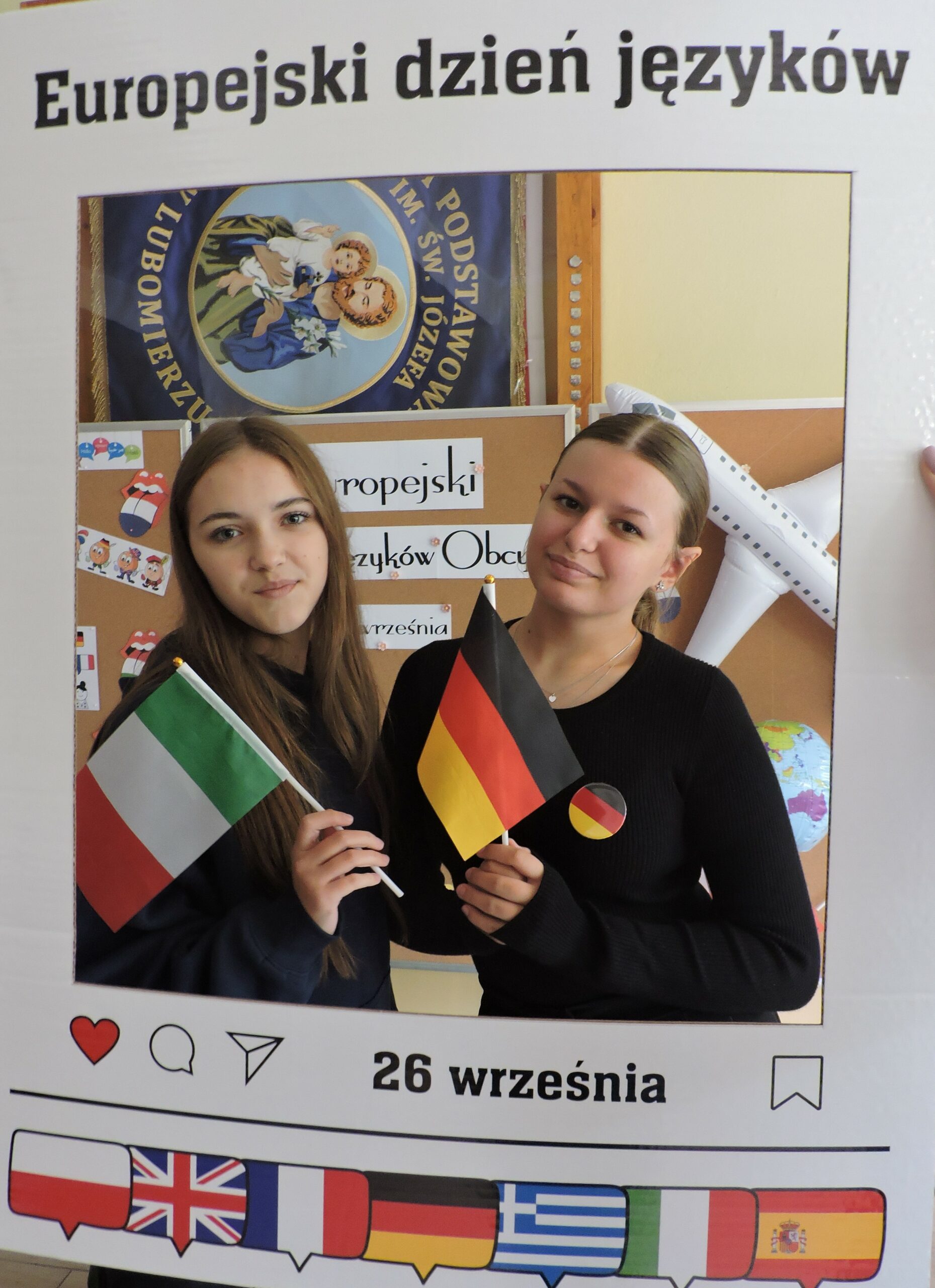 26 września w Szkole Podstawowej im. Św. Józefa w Lubomierzu obchodziliśmy Europejski Dzień Języków Obcych – wyjątkowe wydarzenie, które przypomina, jak ważną rolę pełnią języki w budowaniu więzi między ludźmi i kulturami. To był dzień pełen zabawy, nauki i integracji, w który zaangażowani byli uczniowie, nauczyciel geografii oraz nauczyciel języków obcych. Głównym celem wydarzenia było rozbudzenie ciekawości uczniów wobec języków obcych i kultur innych narodów, a także uświadomienie, jak wielką rolę odgrywają języki w codziennym życiu i przyszłości zawodowej. Ważnym aspektem było również rozwijanie otwartości, empatii i szacunku wobec różnorodności.Na dolnym korytarzu przygotowano specjalną strefę językową – kącik powitań świata oraz językową fotobudkę. Uczniowie odwiedzający pięć stanowisk: angielskie, niemieckie, hiszpańskie, włoskie i francuskie, mogli przywitać się w obcym języku, dowiedzieć się ciekawostek kulturowych oraz obejrzeć tablicę „Jak powiedzieć cześć na świecie?”, na której umieszczono flagi i wymowę powitań. Nauczyciele zachęcali uczniów do rozmów o tym, jak różnorodność językowa buduje wzajemny szacunek.