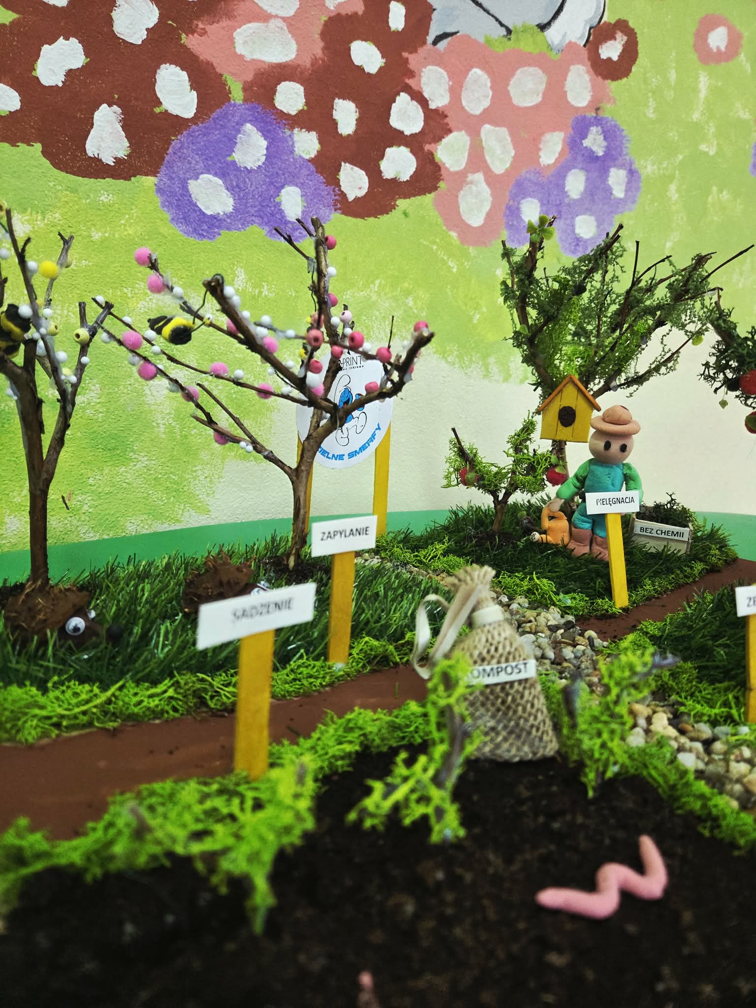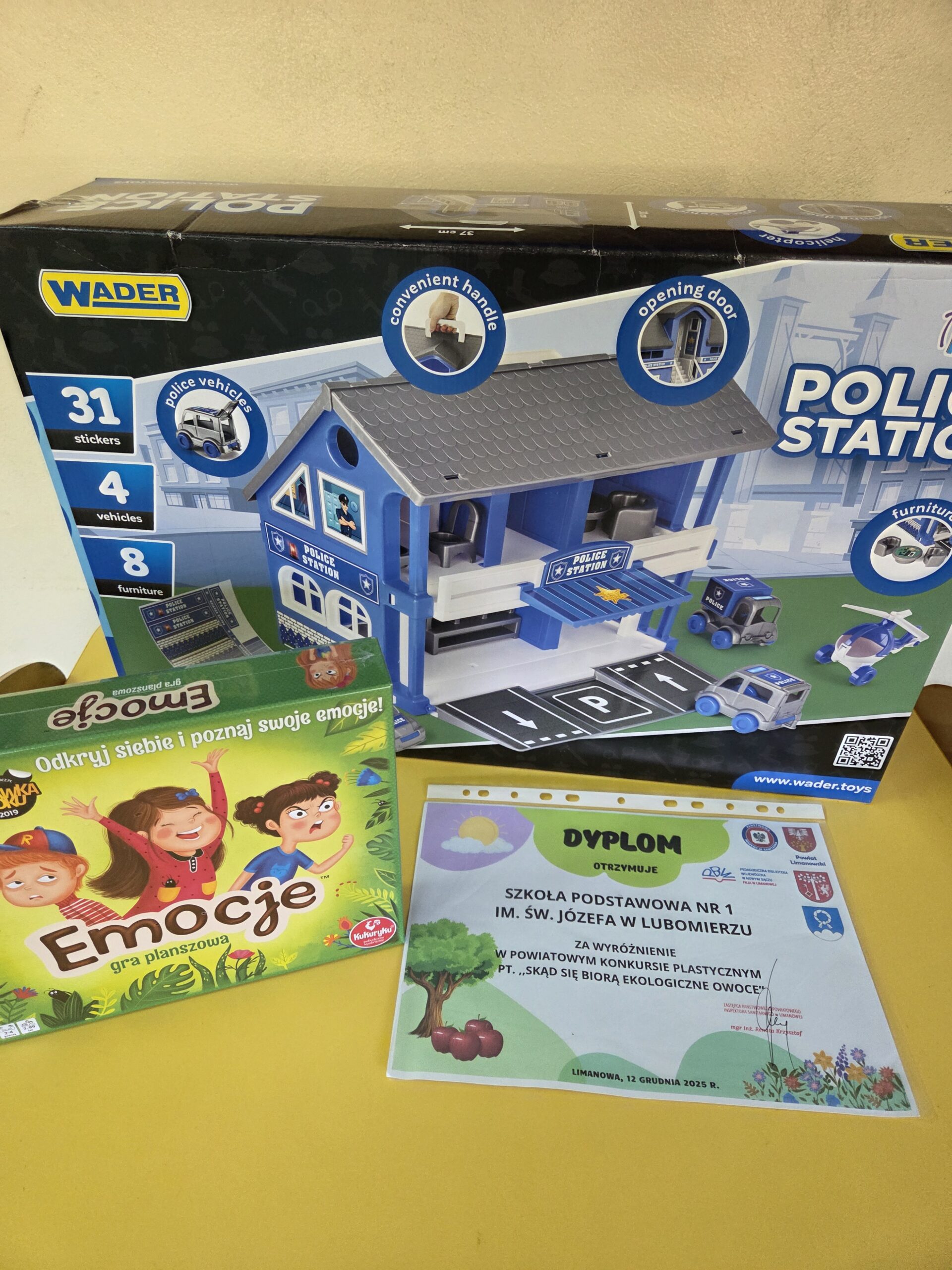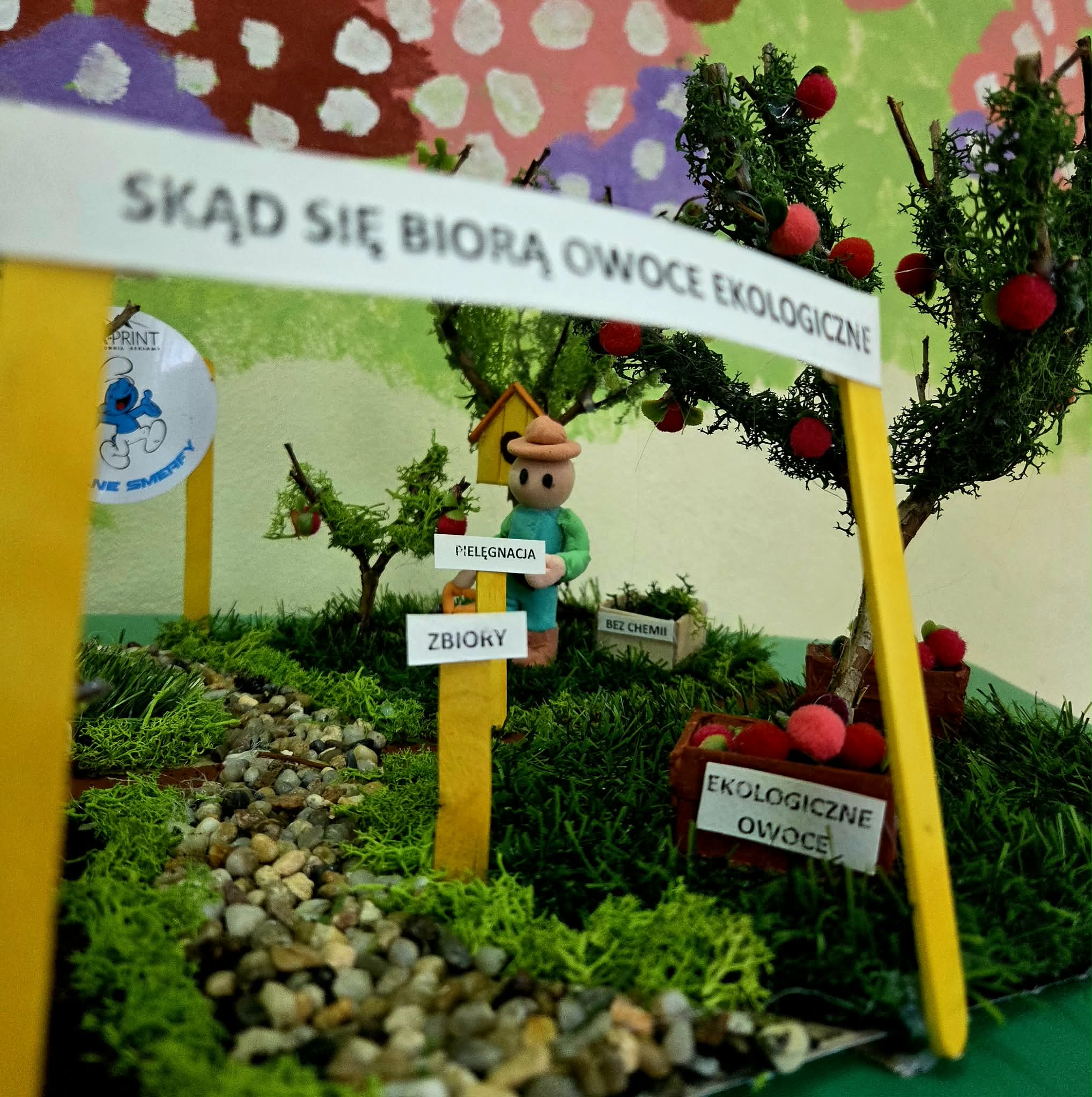 Oddział przedszkolny 0B „Dzielne Smerfy” otrzymał wyróżnienie w Powiatowym Konkursie Plastycznym pt. „Skąd się biorą ekologiczne owoce”, organizowanym przez Państwowego Powiatowego Inspektora Sanitarnego w Limanowej w ramach ogólnopolskiego programu edukacyjnego „Skąd się biorą produkty ekologiczne”. Zadaniem konkursowym było wykonanie grupowej, przestrzennej makiety, która w czytelny sposób pokazuje proces powstawania ekologicznych owoców – od sadzenia i pielęgnacji drzew, przez rolę przyrody i bioróżnorodności, aż po zbiory, zgodnie z zasadami rolnictwa ekologicznego. Przygotowana praca została wyróżniona przez komisję konkursową. Makieta ukazała, że zdrowe owoce nie biorą się z przypadku, lecz są efektem troski o naturę i pracy rolnika ekologicznego. W ramach wyróżnienia oddział otrzymał nagrody rzeczowe, grę edukacyjną oraz pamiątkowy dyplom. Udział w konkursie był dla dzieci cennym doświadczeniem edukacyjnym i okazją do rozwijania postaw proekologicznych już na etapie wychowania przedszkolnego.