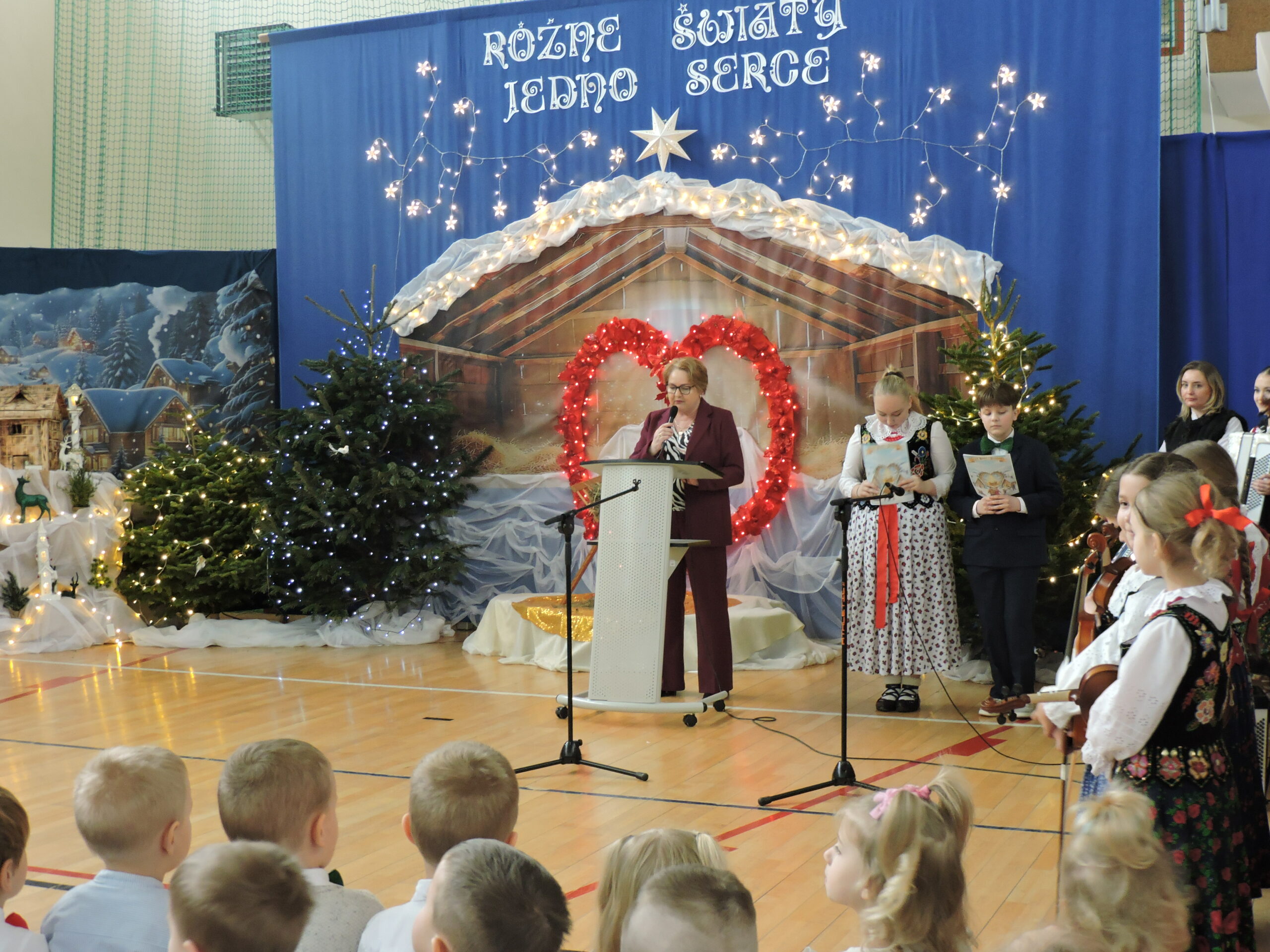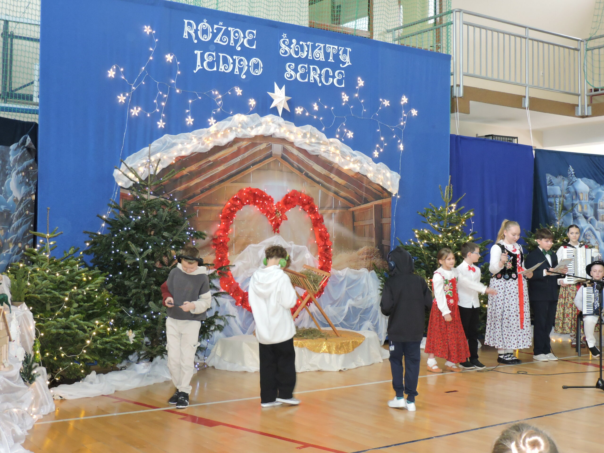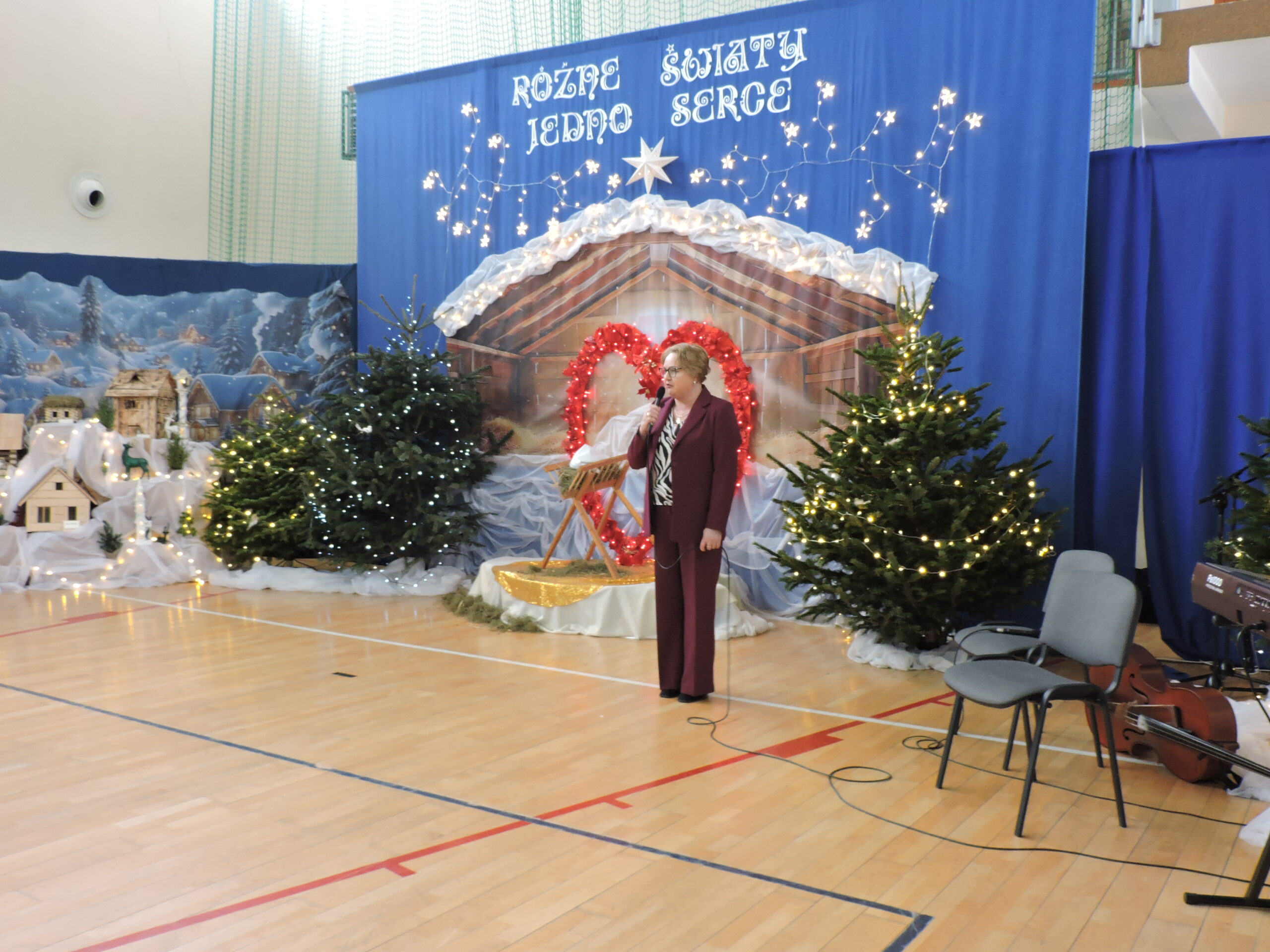 Sala gimnastyczna zmieniła się tego dnia nie do poznania – przepiękna dekoracja przeniosła widzów w świat refleksji i świątecznego ciepła, tworząc idealne tło dla spektaklu pod tytułem „RÓŻNE ŚWIATY, JEDNO SERCE”. Każdy element scenografii został starannie przemyślany, by oddać głębię przedstawienia. Gra świateł, subtelne ozdoby i dbałość o detale sprawiły, że przestrzeń ta nabrała niemal mistycznego charakteru, wywołując zachwyt na twarzach gości już od progu. Niezwykły klimat sali to również zasługa Państwa Foksów, którym składamy gorące podziękowania za przywiezienie żywych choinek. Ich naturalna zieleń były idealnym dopełnieniem dekoracji, wprowadzając do wnętrza autentyczny, świąteczny nastrój.