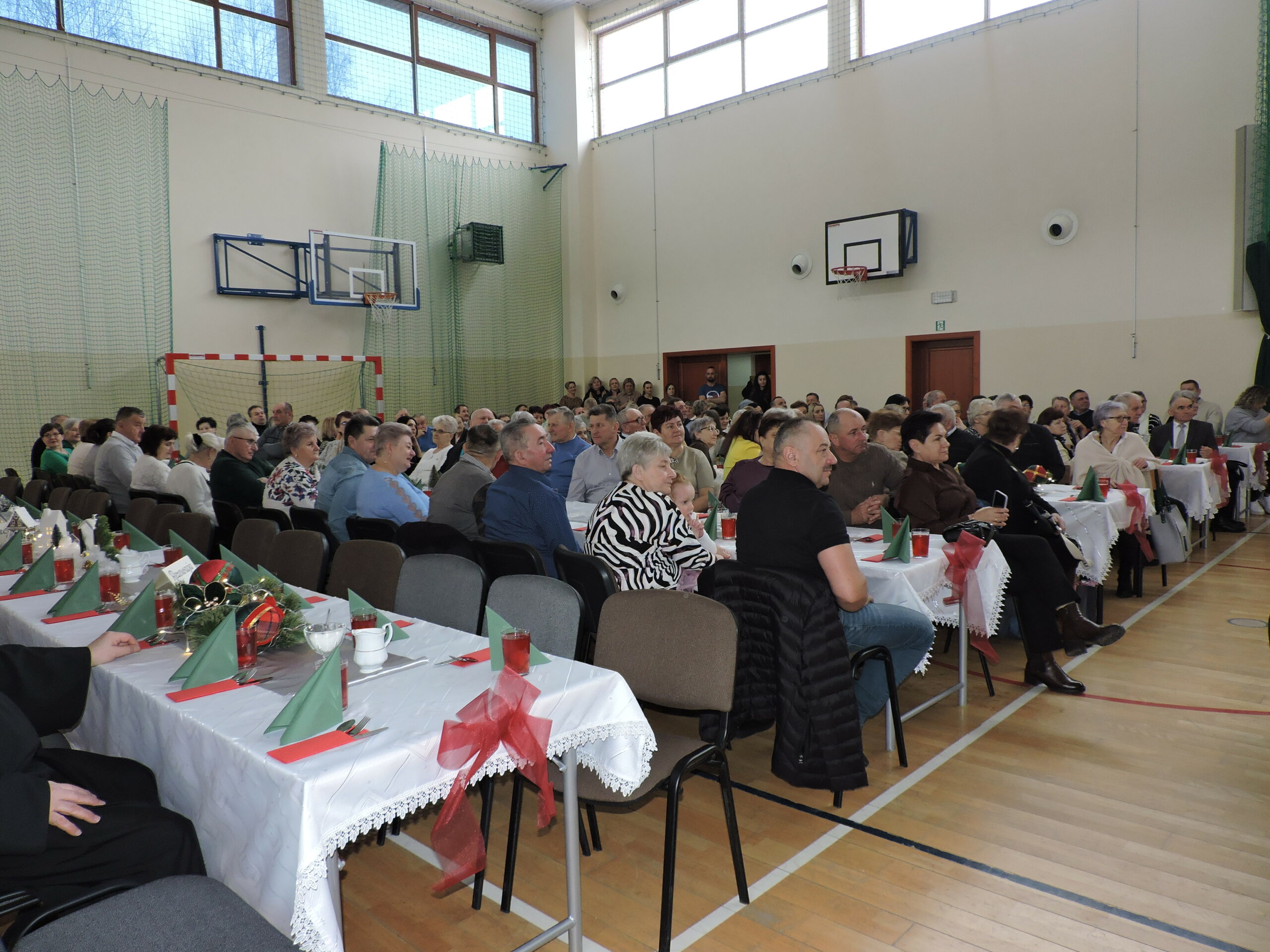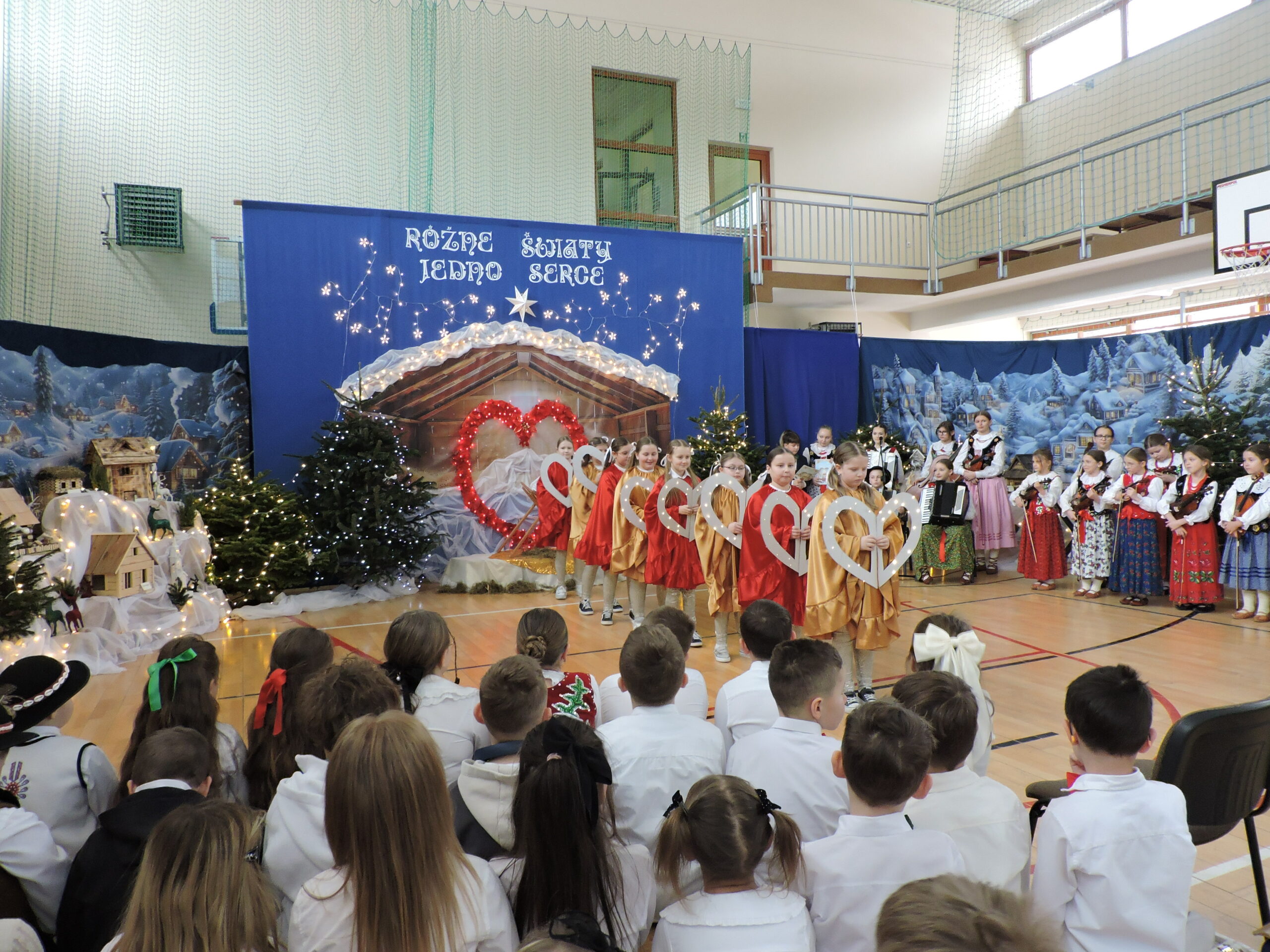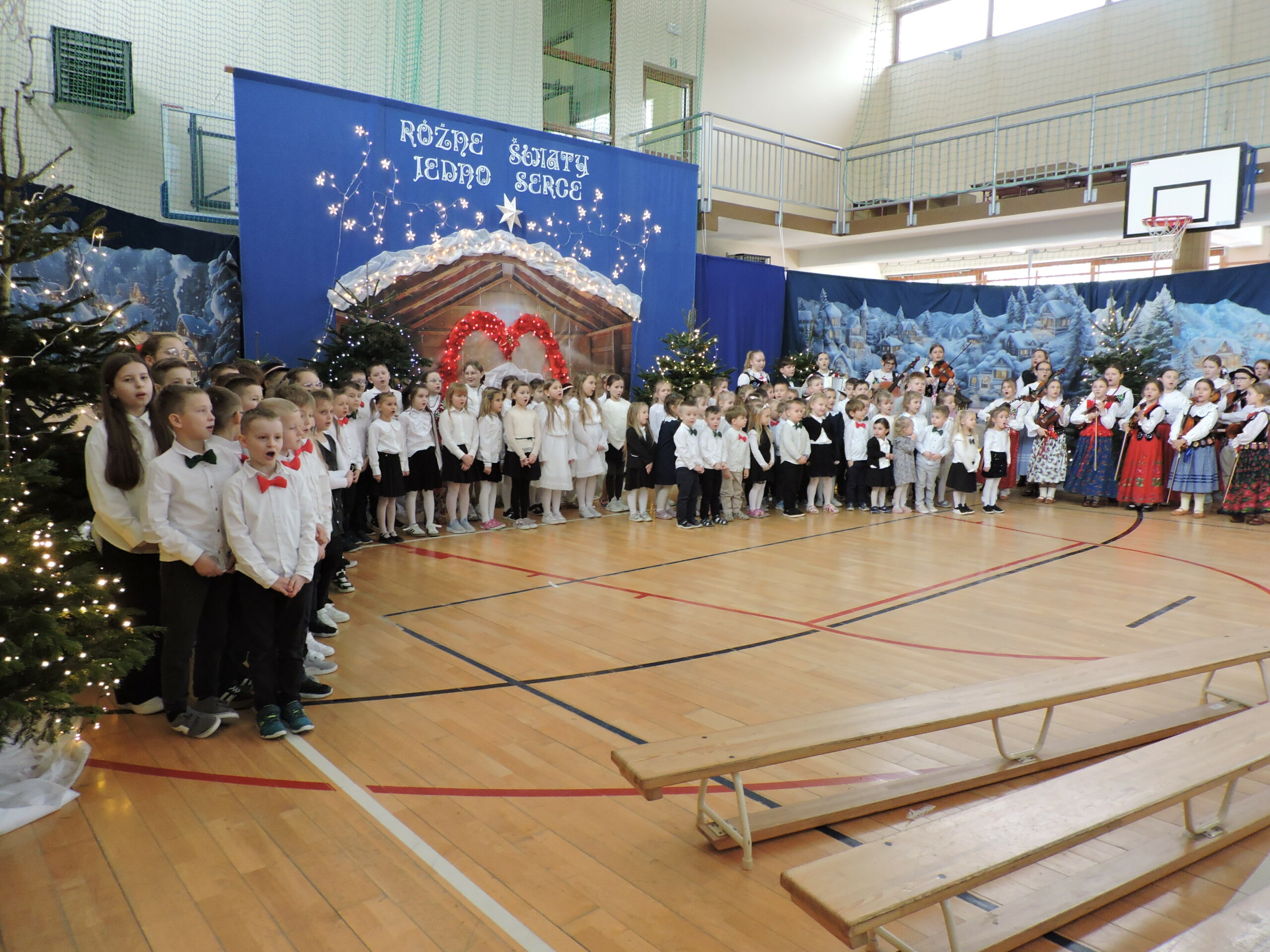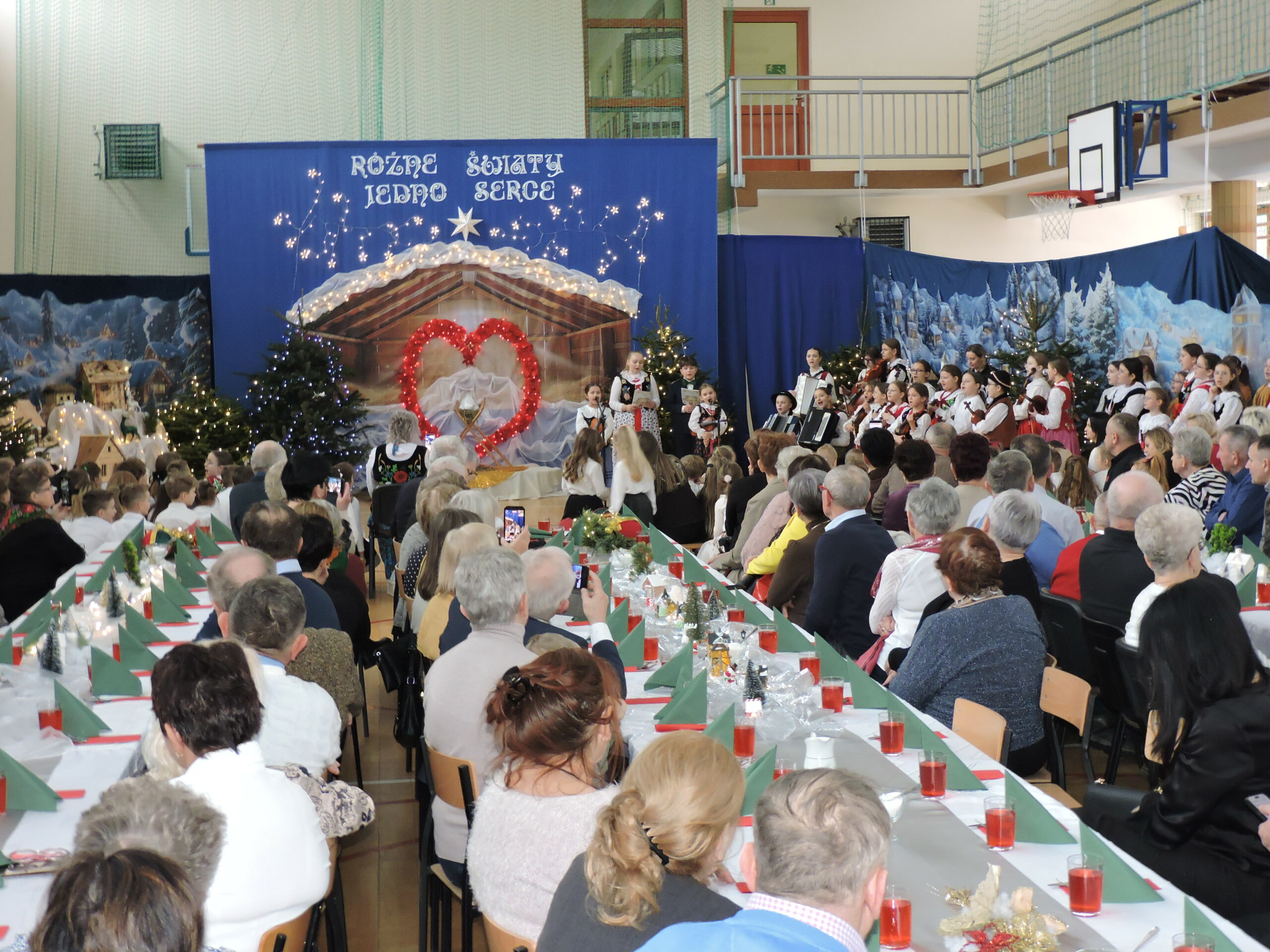 Sala gimnastyczna zmieniła się tego dnia nie do poznania – przepiękna dekoracja przeniosła widzów w świat refleksji i świątecznego ciepła, tworząc idealne tło dla spektaklu pod tytułem „RÓŻNE ŚWIATY, JEDNO SERCE”. Każdy element scenografii został starannie przemyślany, by oddać głębię przedstawienia. Gra świateł, subtelne ozdoby i dbałość o detale sprawiły, że przestrzeń ta nabrała niemal mistycznego charakteru, wywołując zachwyt na twarzach gości już od progu. Niezwykły klimat sali to również zasługa Państwa Foksów, którym składamy gorące podziękowania za przywiezienie żywych choinek. Ich naturalna zieleń były idealnym dopełnieniem dekoracji, wprowadzając do wnętrza autentyczny, świąteczny nastrój.