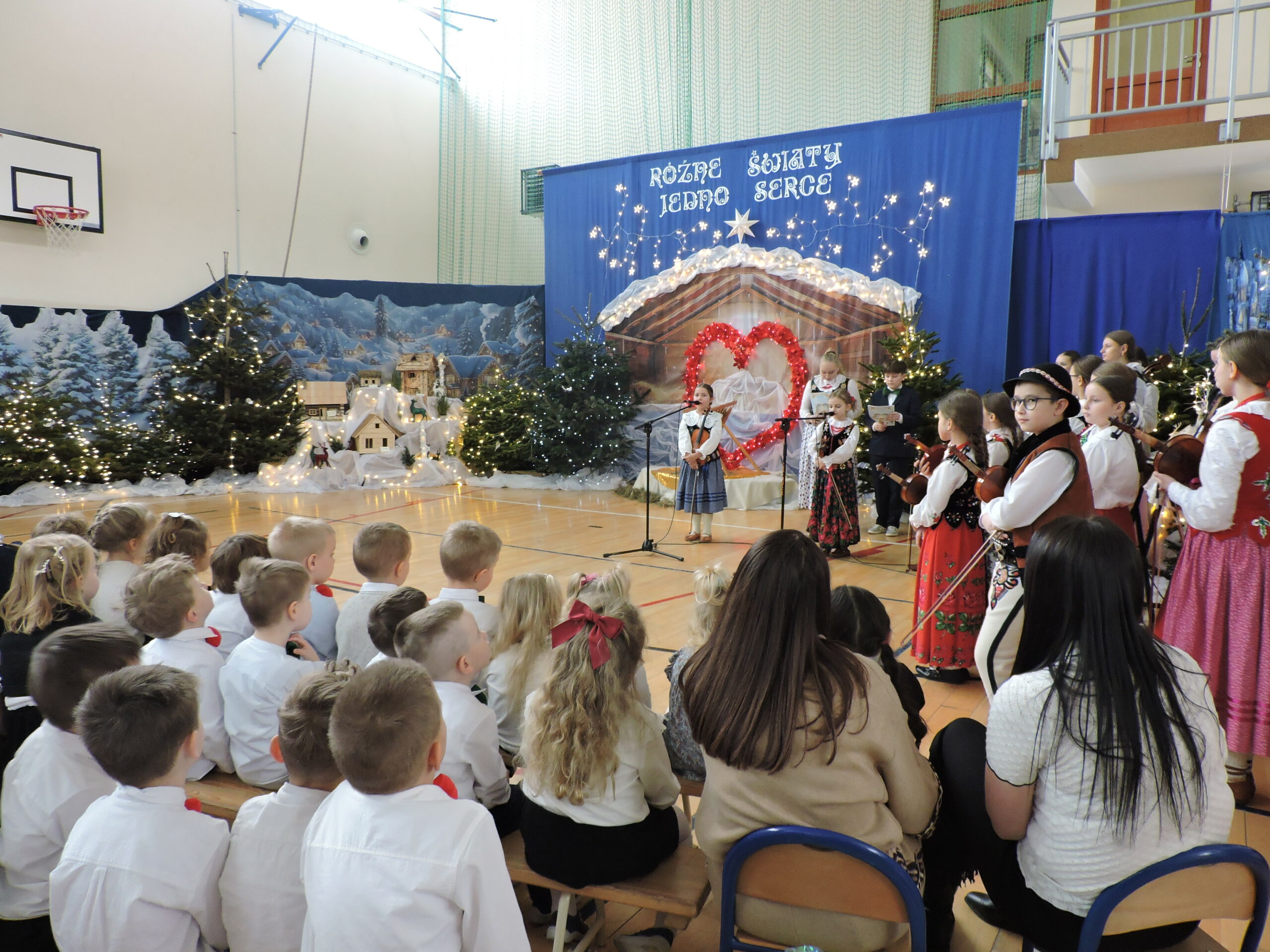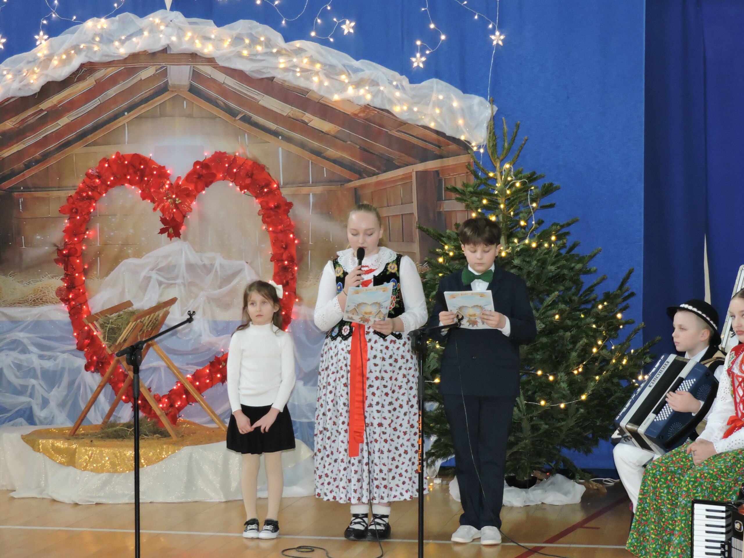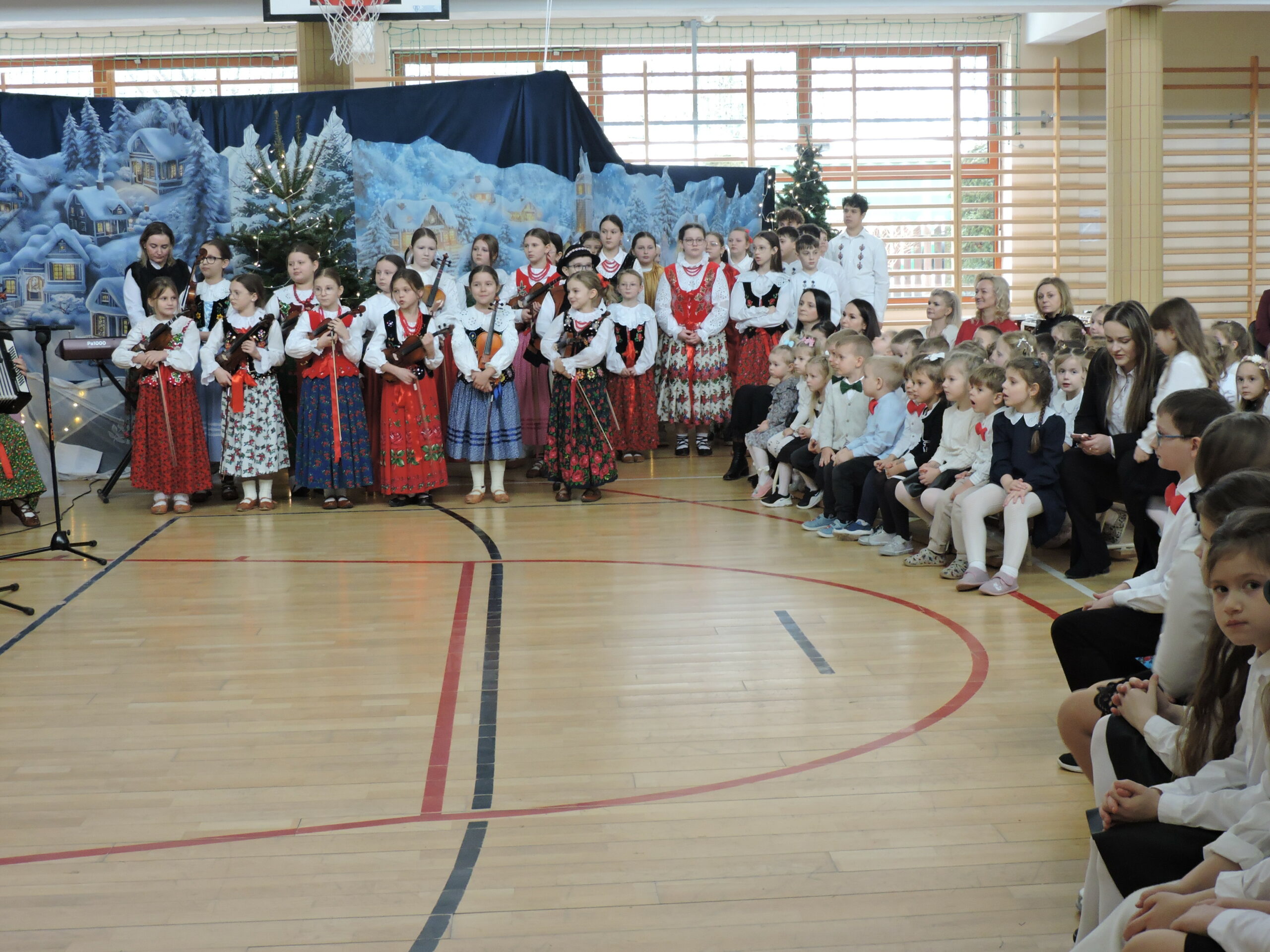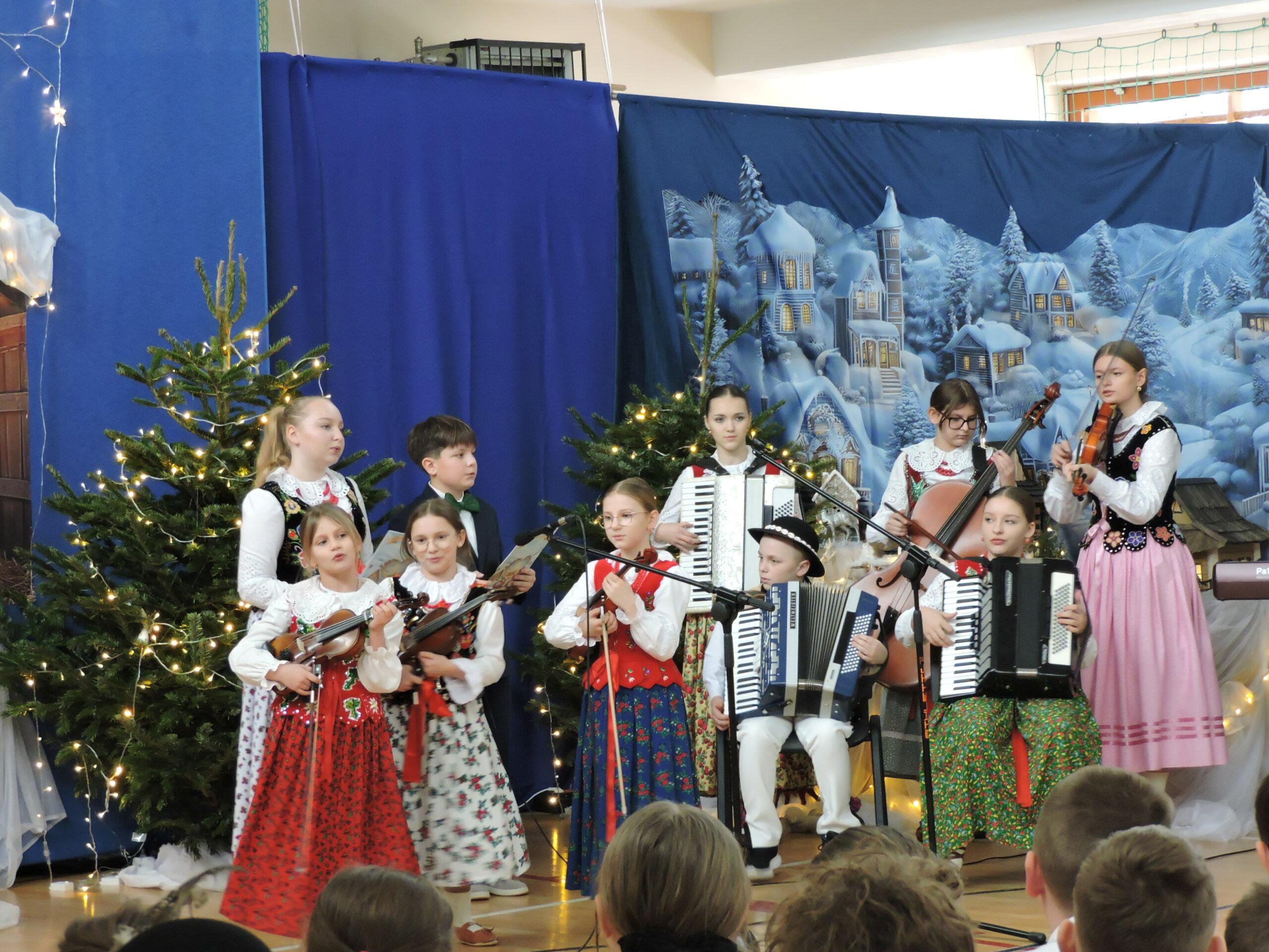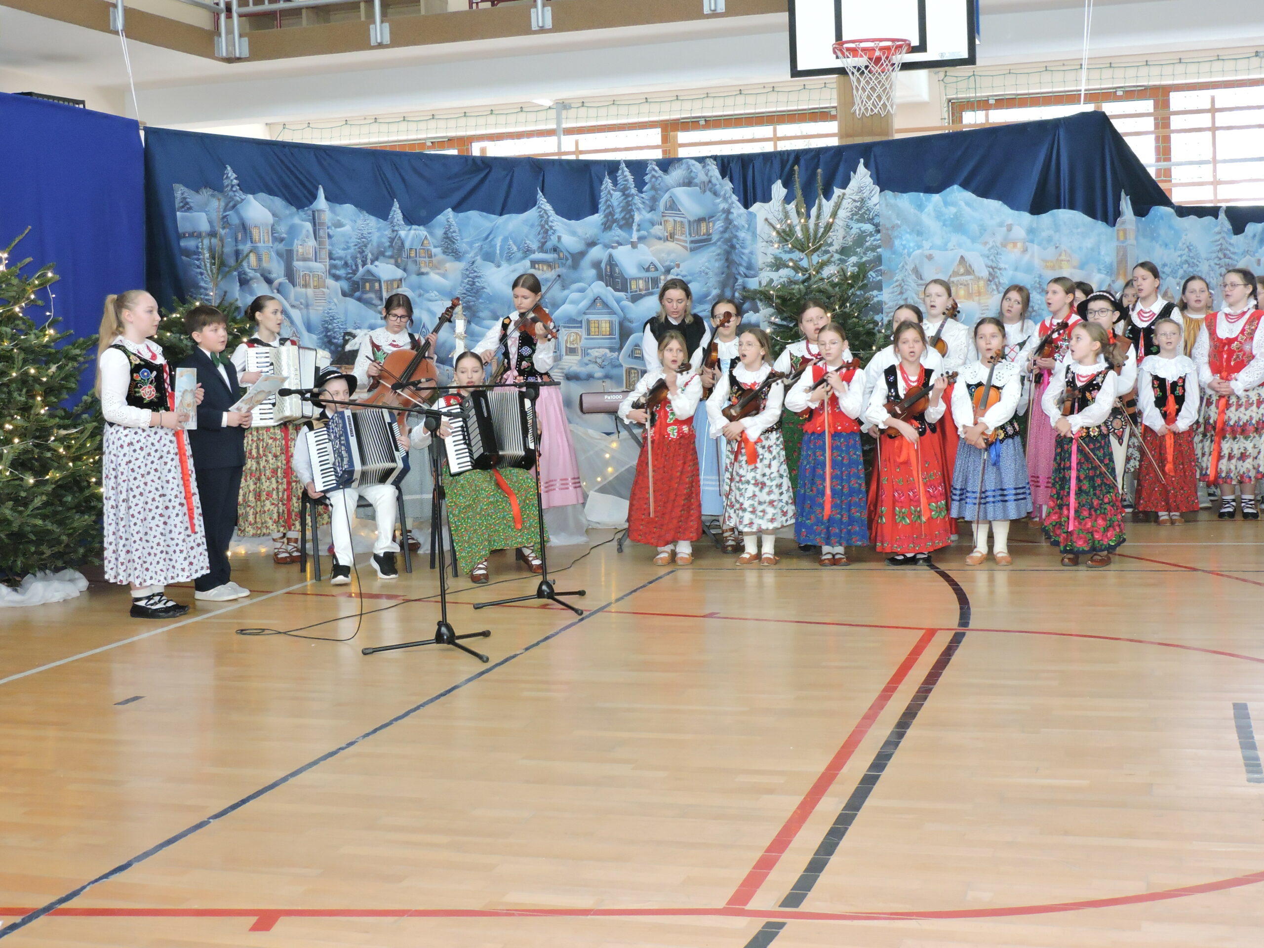 Tegoroczna akademia była prawdziwą ucztą muzyczną. Na scenie zaprezentowało się bardzo wielu uczniów śpiewających i grających na instrumentach. Sala wypełniła się dźwiękami skrzypiec, akordeonów i basów, co nadało uroczystości wyjątkowego, tradycyjnego charakteru. Widzowie mieli okazję usłyszeć nie tylko znane melodie, ale także autorskie pastorałki pani Doroty Wcisło, które wzruszały tekstem i aranżacją. Całość dopełnił piękny układ taneczny, nagrodzony gromkimi brawami.