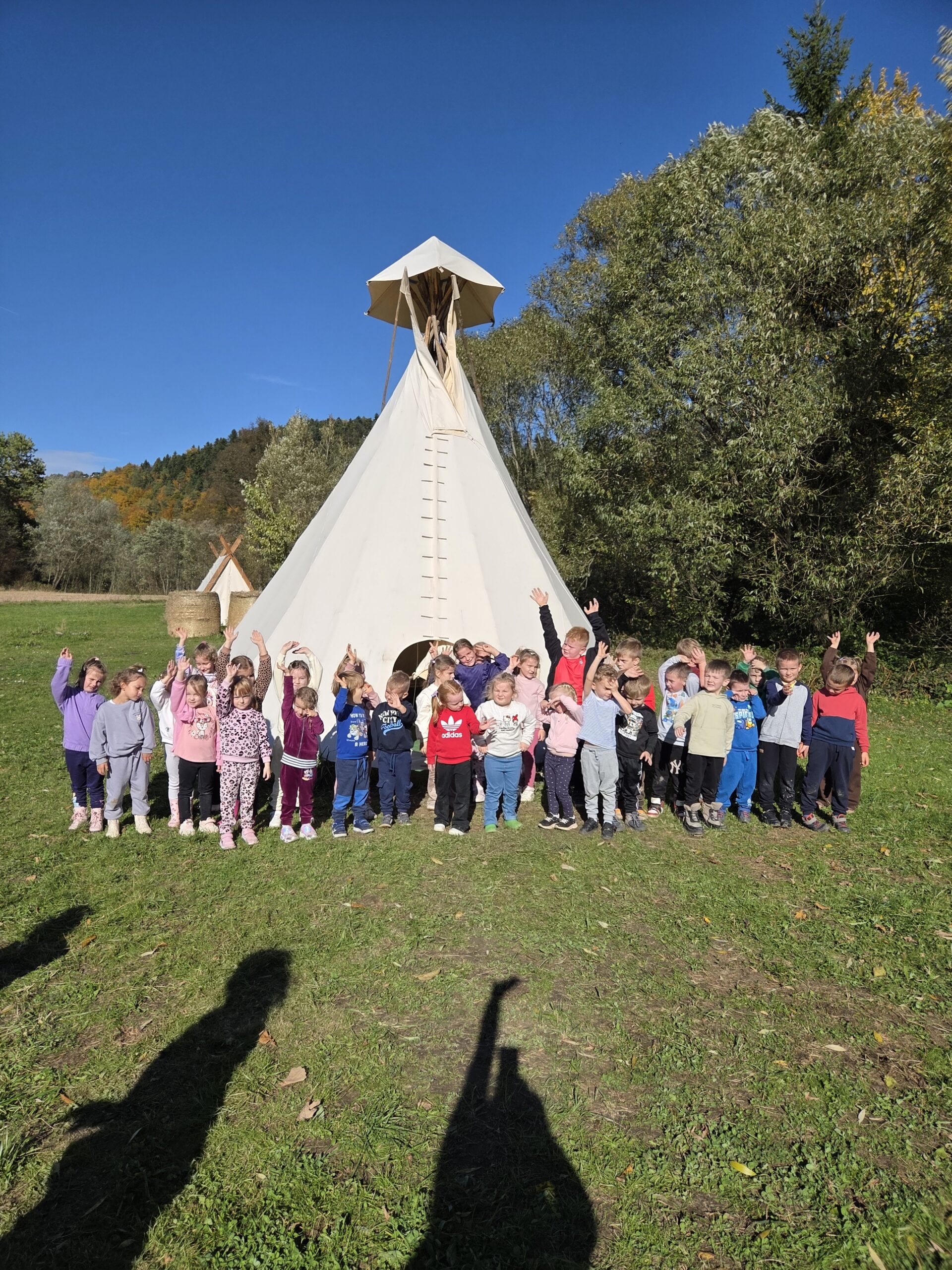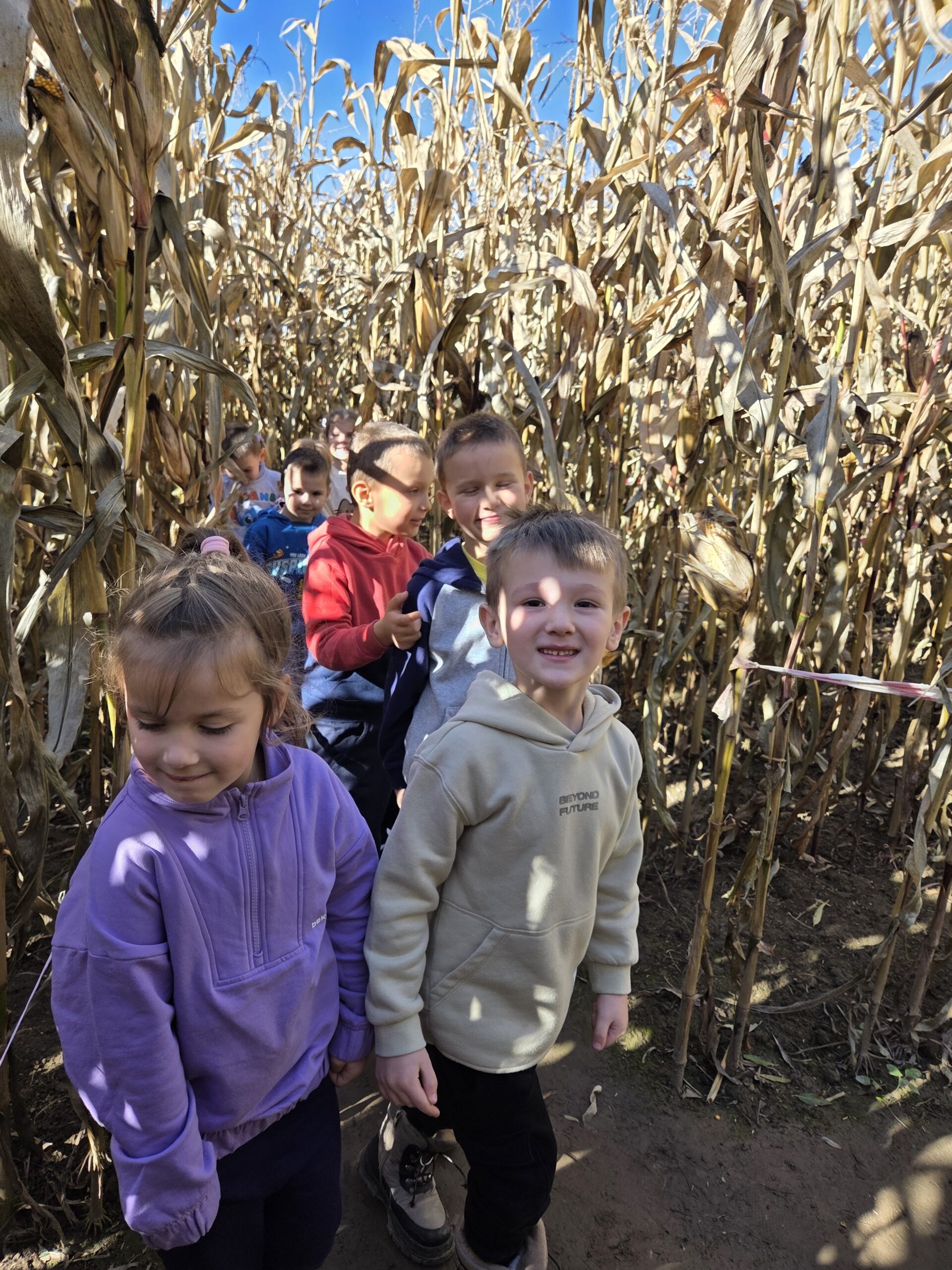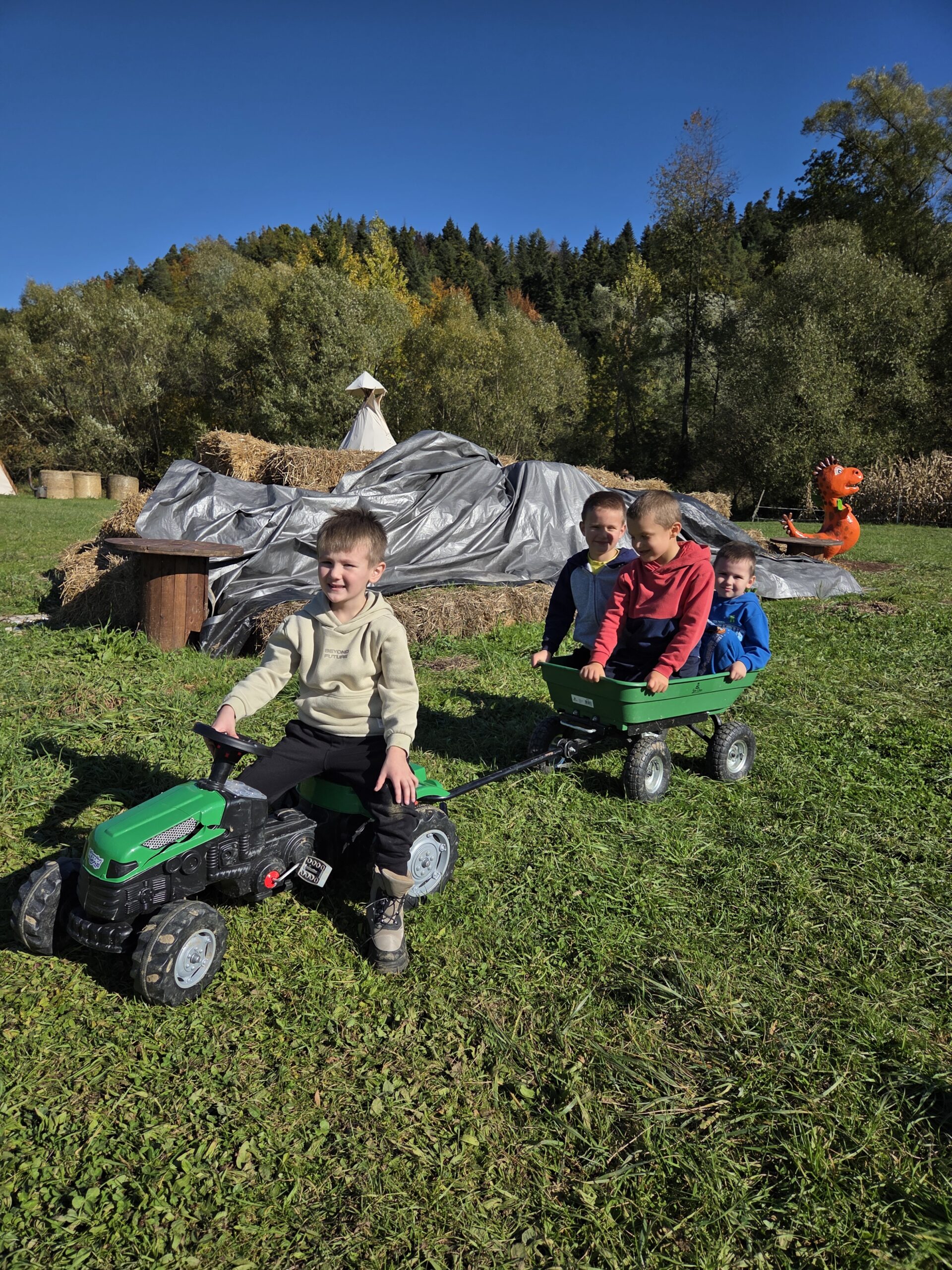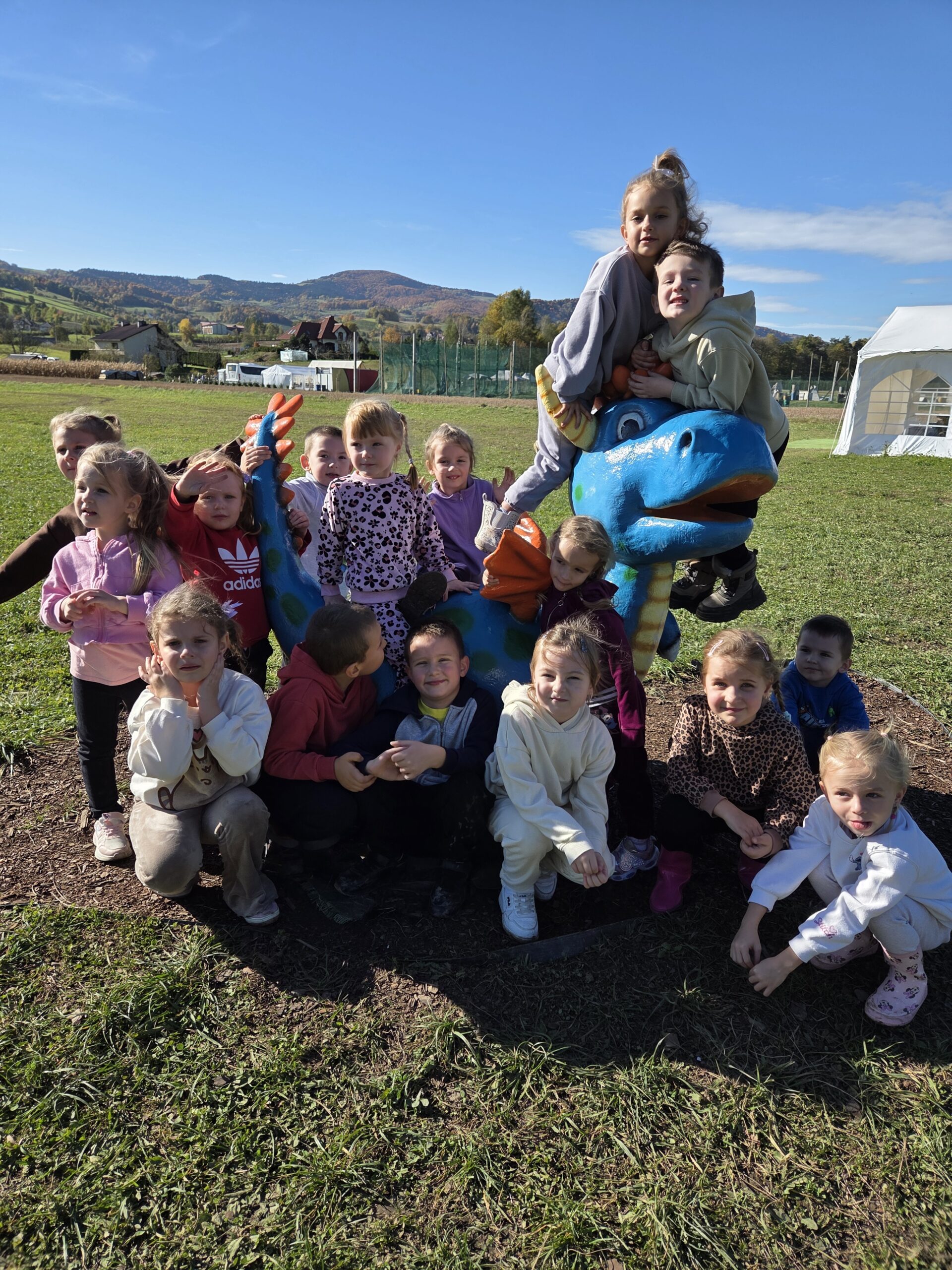 W czwartek, 23 października, dzieci z oddziału przedszkolnego uczestniczyły w wyjątkowej wycieczce do Smoczej Osady w Żbikowicach. To malownicze miejsce położone wśród natury stało się sceną wielu radosnych aktywności, które na długo pozostaną w pamięci najmłodszych uczestników. Program pobytu obfitował w atrakcje dostosowane do wieku dzieci. Przedszkolaki miały okazję karmić zwierzęta gospodarskie, wziąć udział w emocjonującej zabawie w przeciąganie liny, a także odkrywać zakamarki kukurydzianego labiryntu, który wzbudził wiele radości i śmiechu.Po intensywnych aktywnościach na świeżym powietrzu przyszedł czas na chwilę odpoczynku i wspólny posiłek. Dzieci z apetytem zjadły domowy rosół i świeże ciasto drożdżowe, które były pysznym zwieńczeniem dnia.